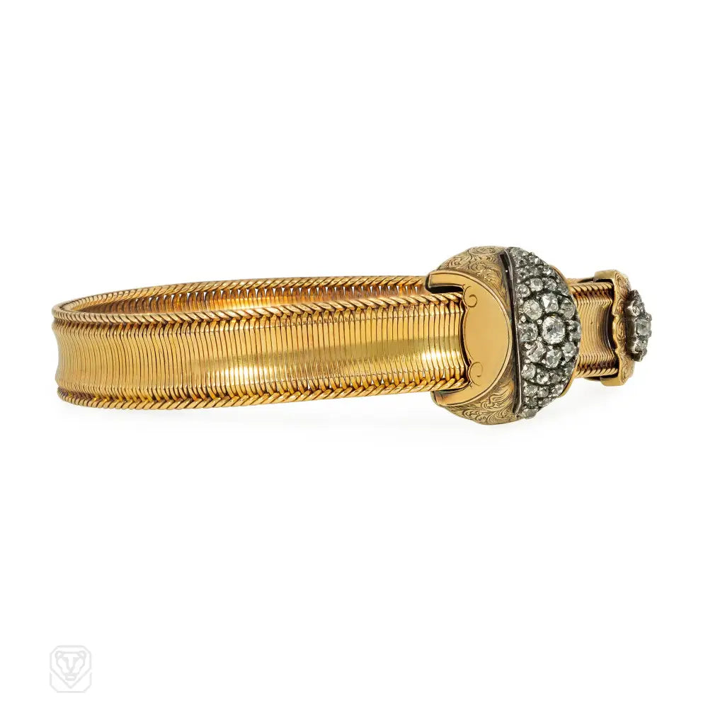 A Victorian gold and diamond adjustable jarretiere bracelet, the woven gold strap fitted through a foliate-carved gold buckle set with diamonds in a radiating lozenge pattern, and terminating in a foliate-carved gold end tip further set with diamonds in a foliate pattern, in 18k and sterling silver. Atw 0.86 ct.