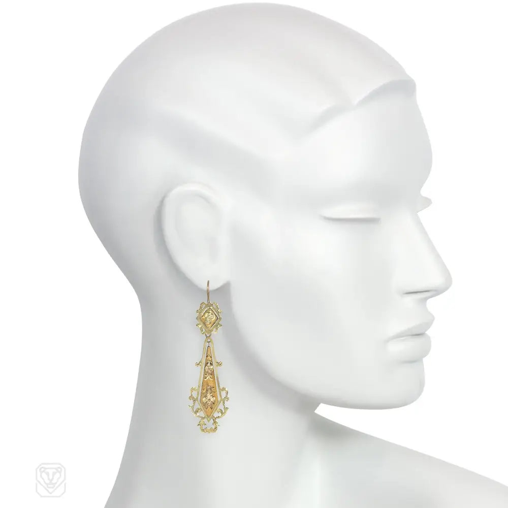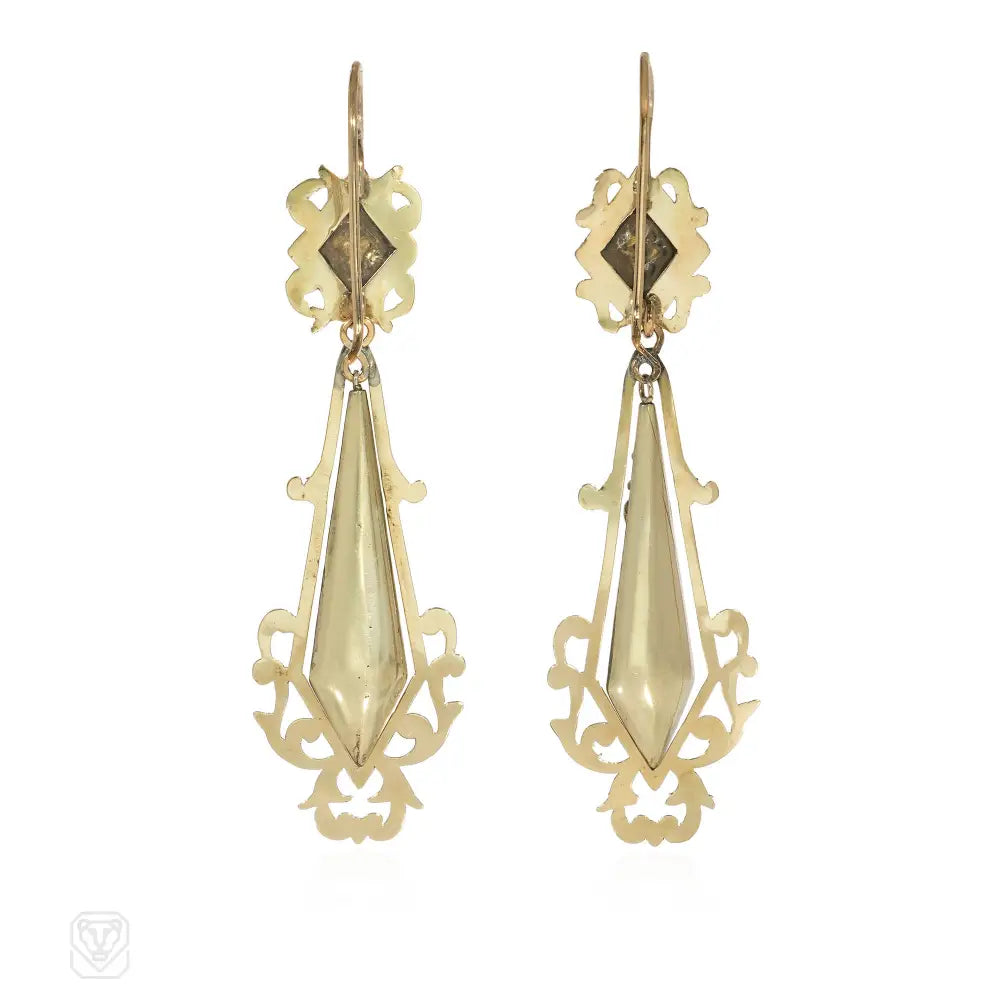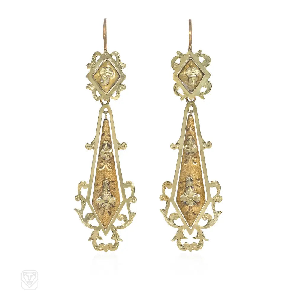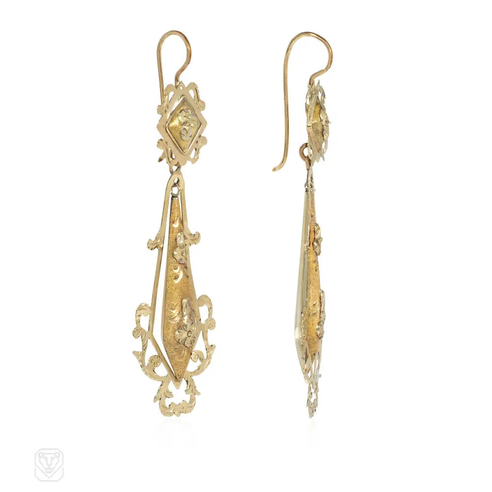 A pair of Georgian gold earrings comprised of kite-shaped gold pendants with applied foliate design suspended from diamond-shaped tops and articulated foliate frames throughout, in 14k. Later wire hook conversion