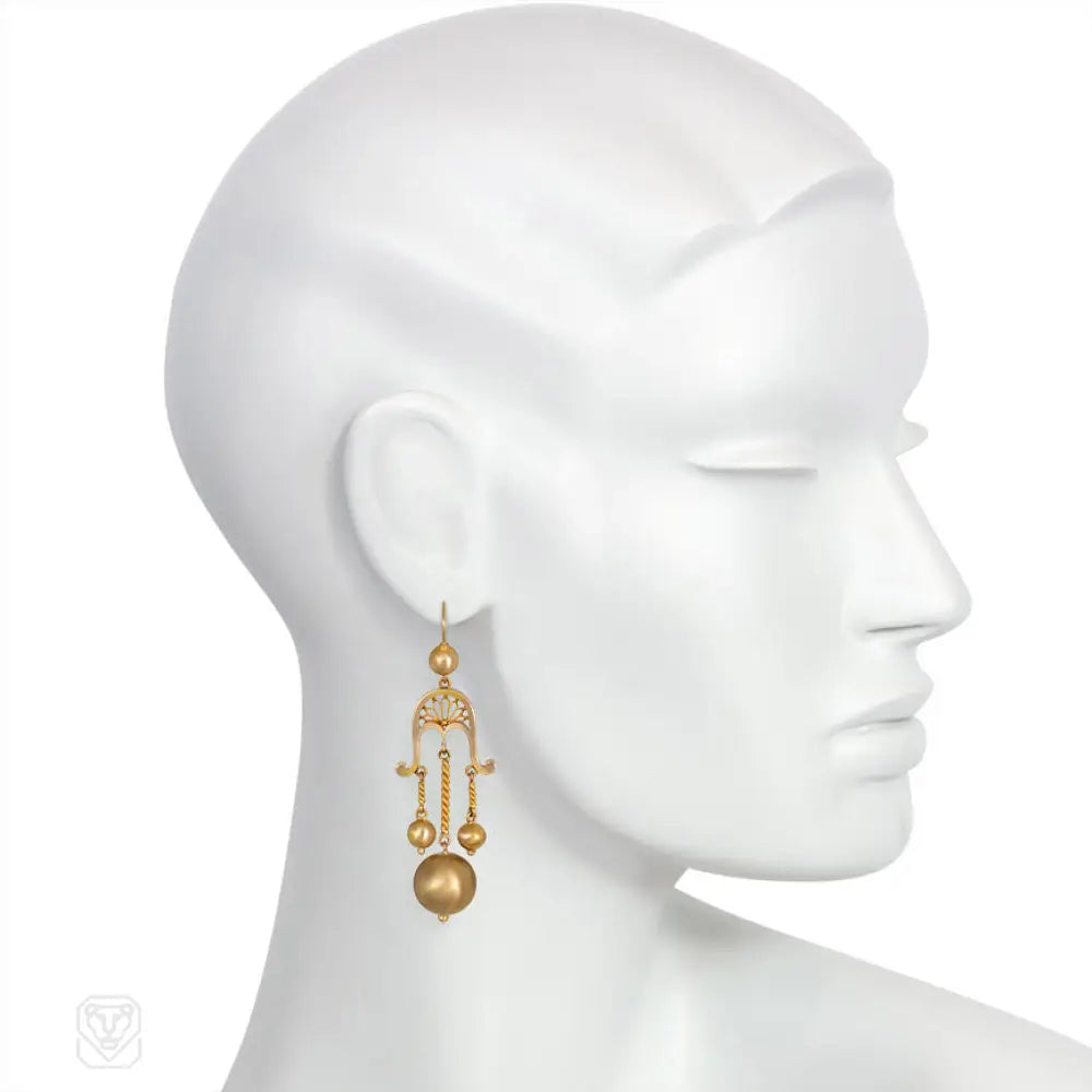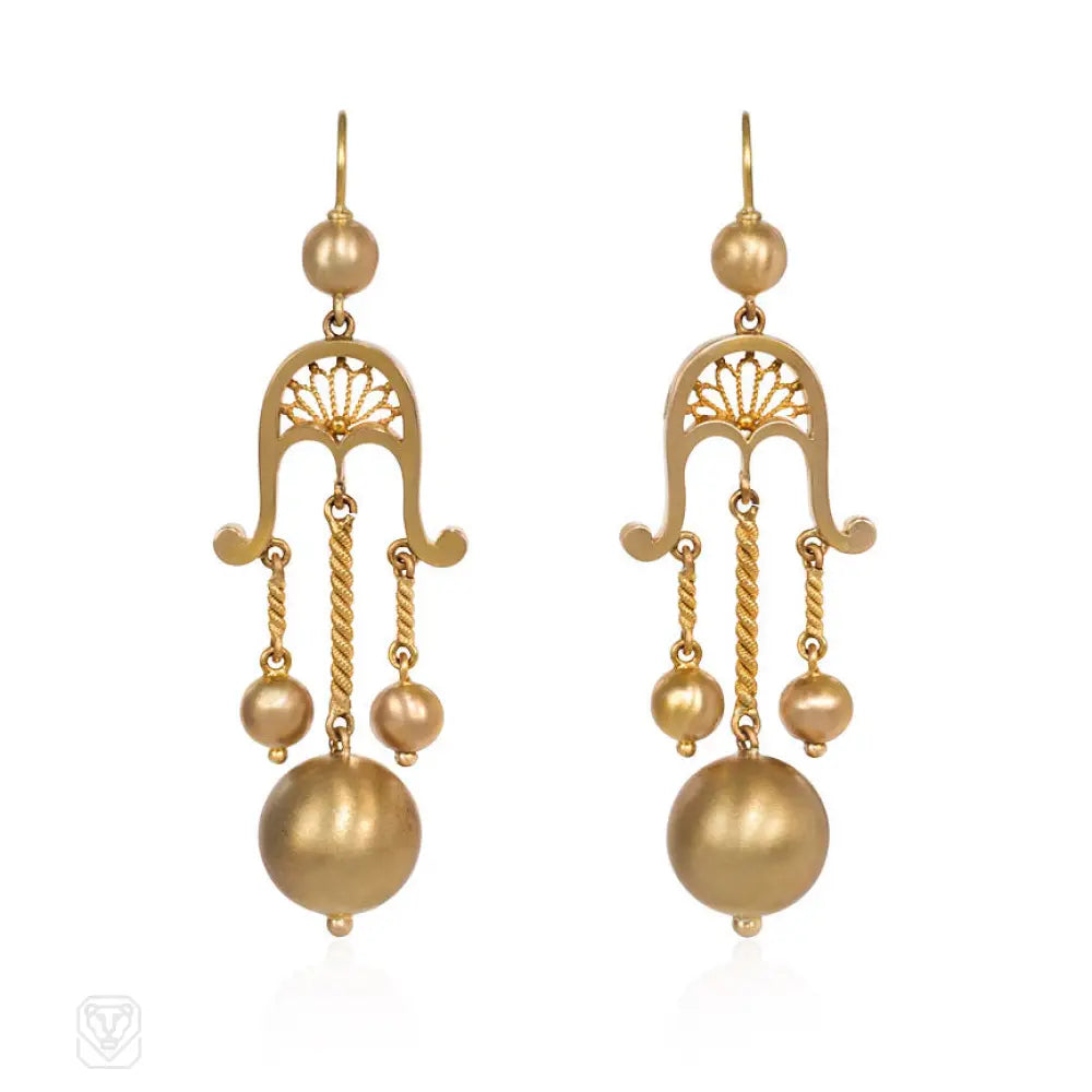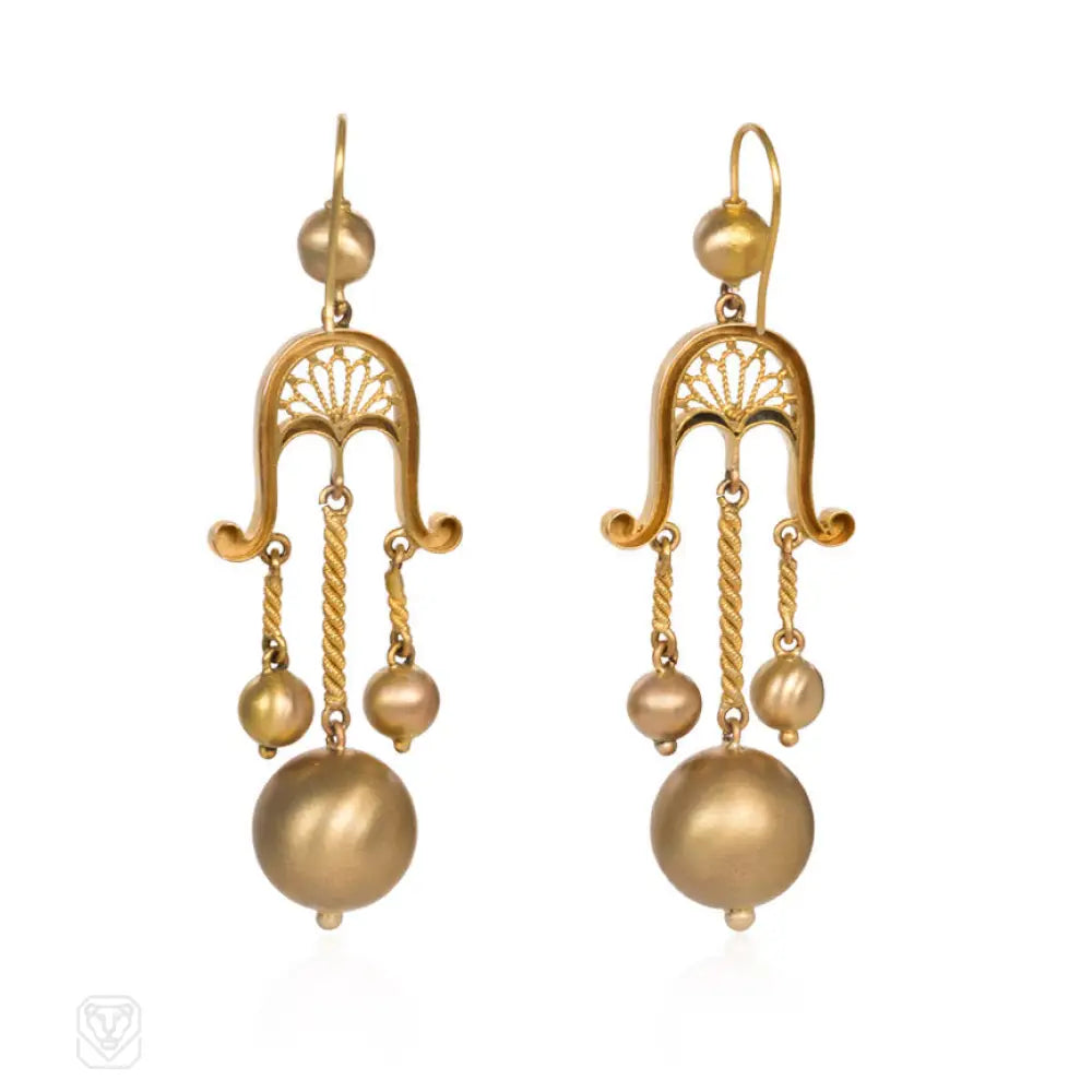A pair of antique gold earrings of girandole design comprised of three ball pendants suspended from a scrolled openwork surmount, in 14k