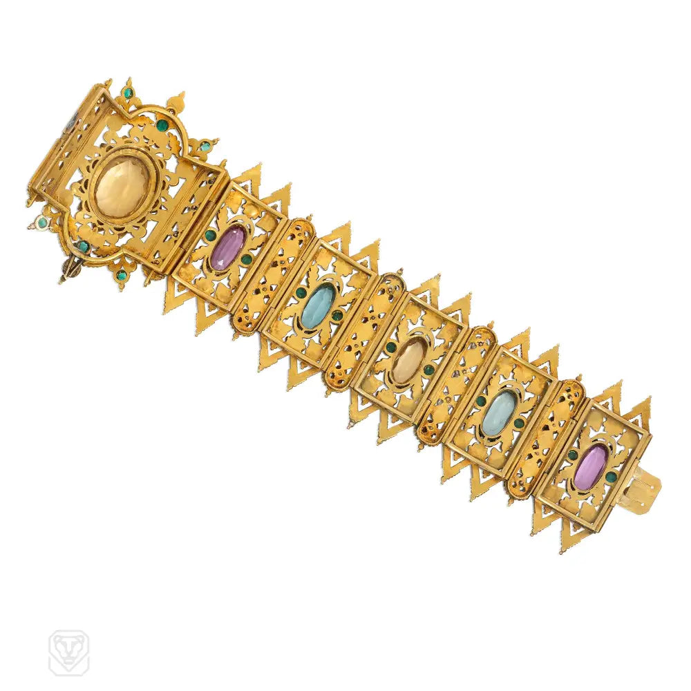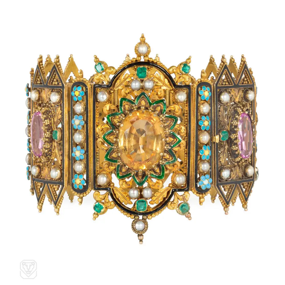 A Gothic Revival multi-gem, enamel, and gold bracelet centered by a double-apsidal, pierced and curved panel, centered by an oval citrine set within a green-enamel and chased gold floral border, and further set with seed pearls and emeralds; giving way to five pierced, rectangular panels, each bordered top-and-bottom by decorative gables, and centered by alternating oval pink topaz, aquamarine, and citrine, and further embellished with gold leaves, seed pearls, and emearalds; each panel seperated by a column of alternating polychrome enamel flowers and seed pearls; with tongue closure, in 18k.