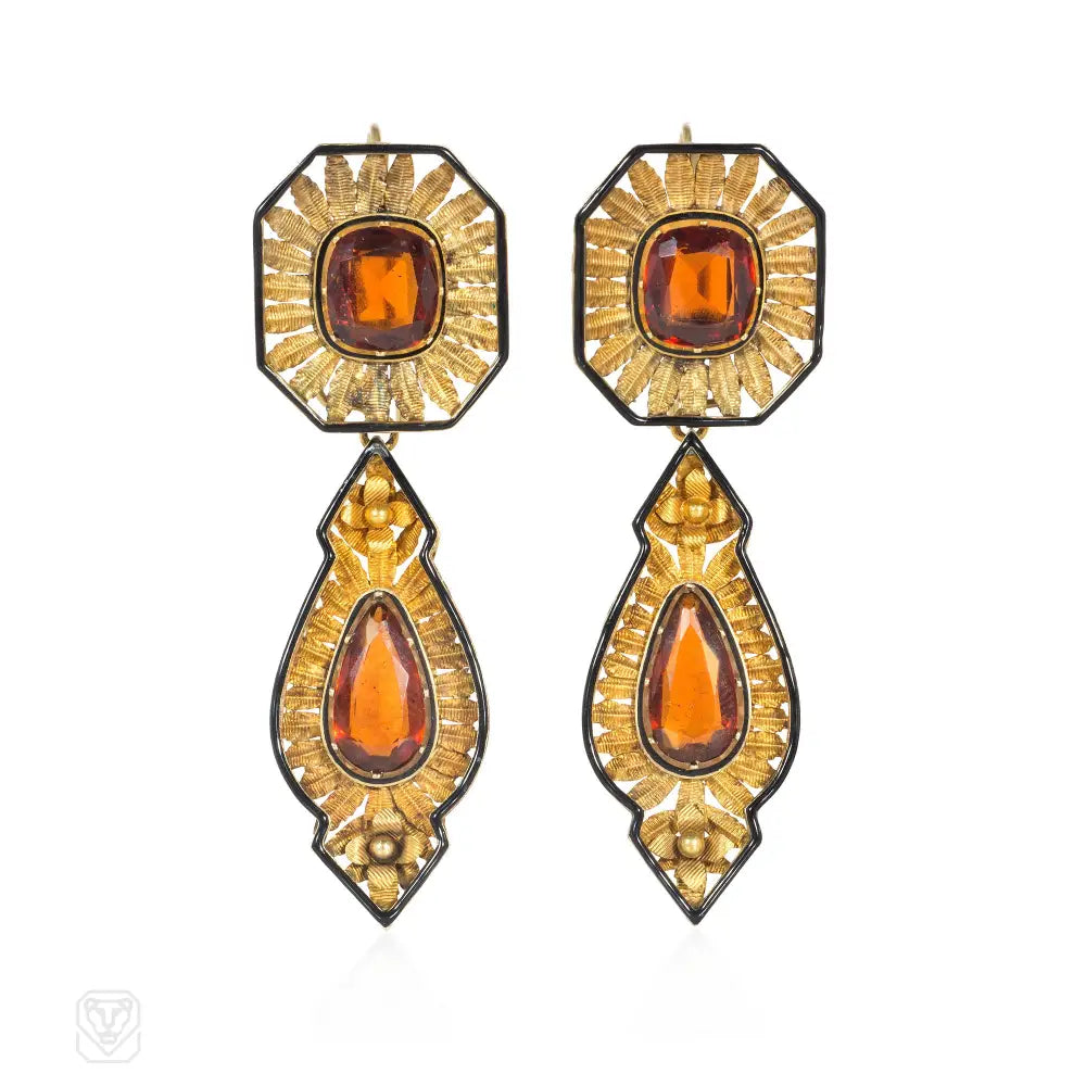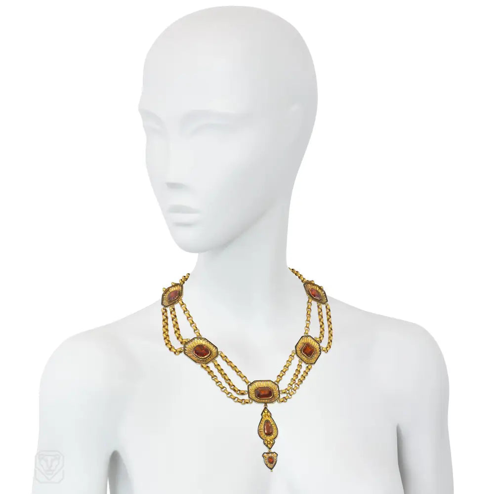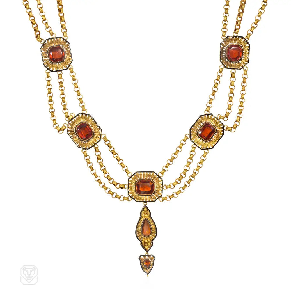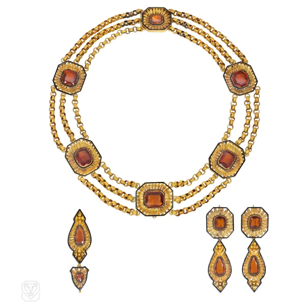 An antique gold, garnet, and enamel demi-parure comprised of a three-row, belcher chain festoon necklace with hessonite garnets in octagonal foliate and black enamel surrounds with a detachable pendant, and a pair of day-to-night pendant earrings of the same design, 18k. Vienna, Austria.