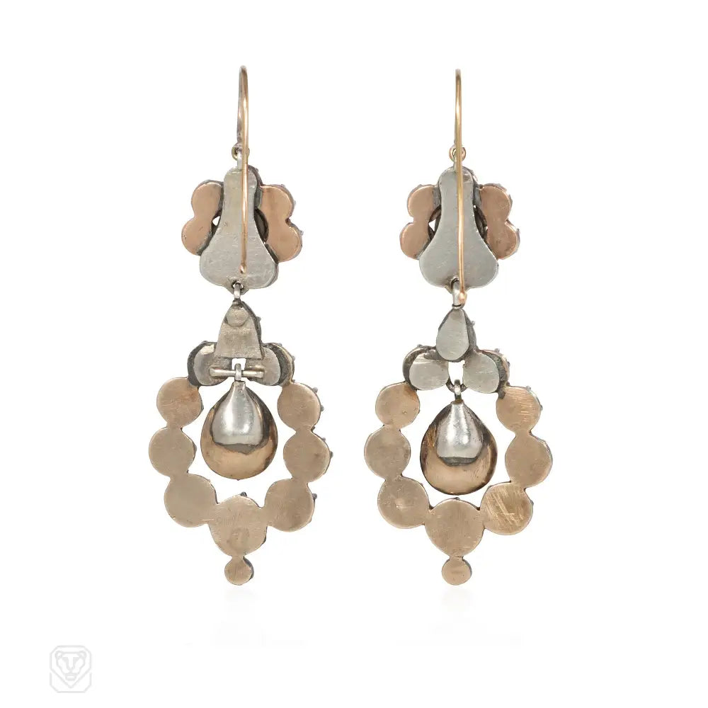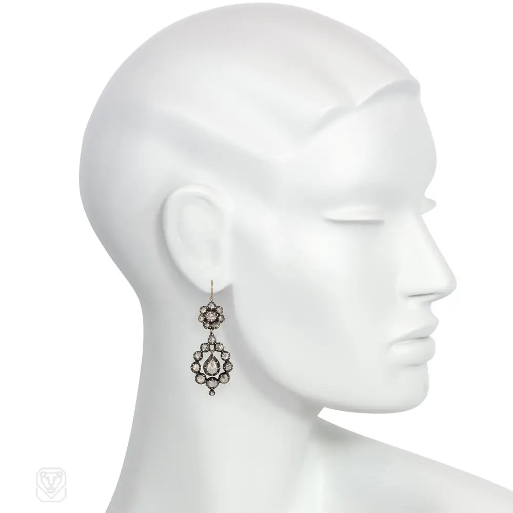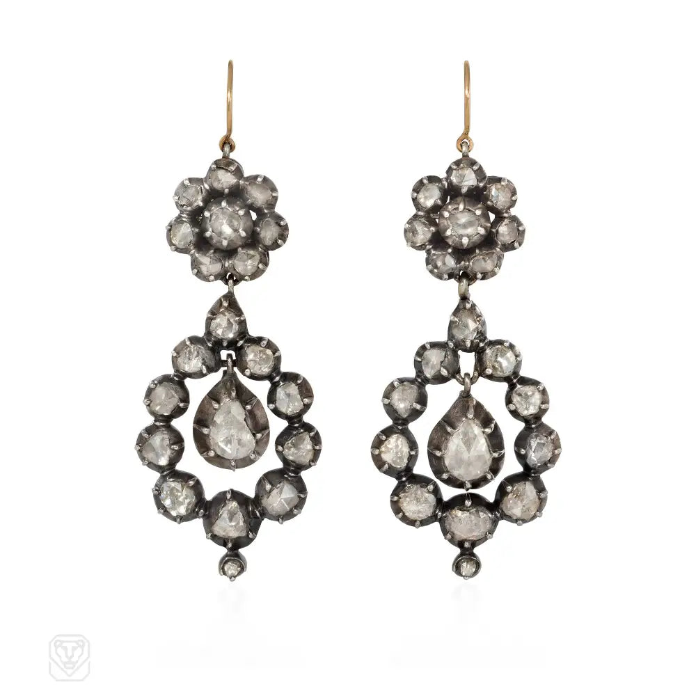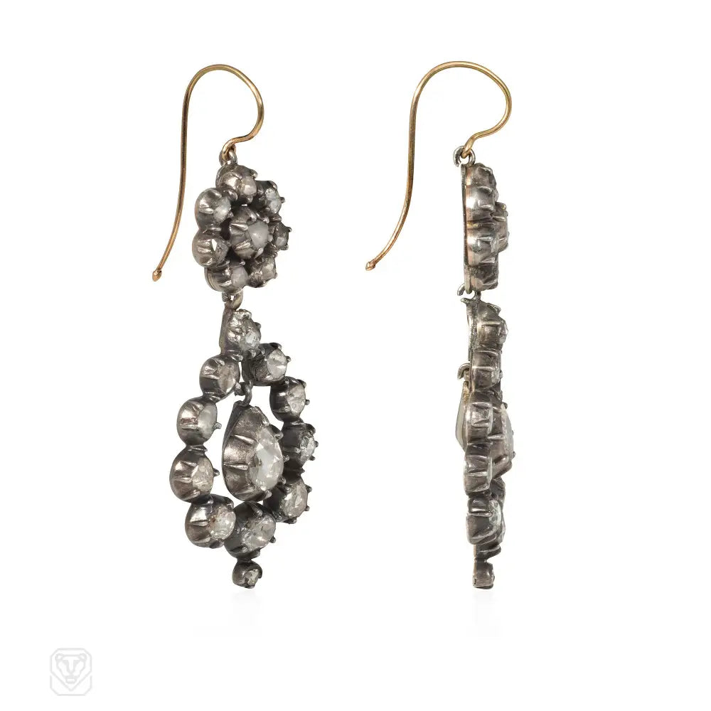 A pair of Georgian rose cut diamond pendant earrings comprised of a pear-shaped diamond in a surrounding frame and suspended from cluster surmounts, in sterling silver and 15k gold. England