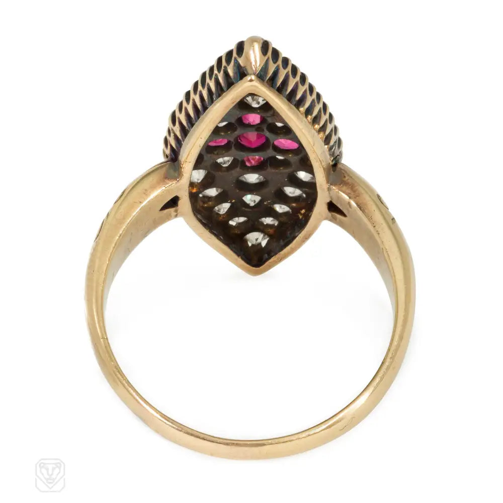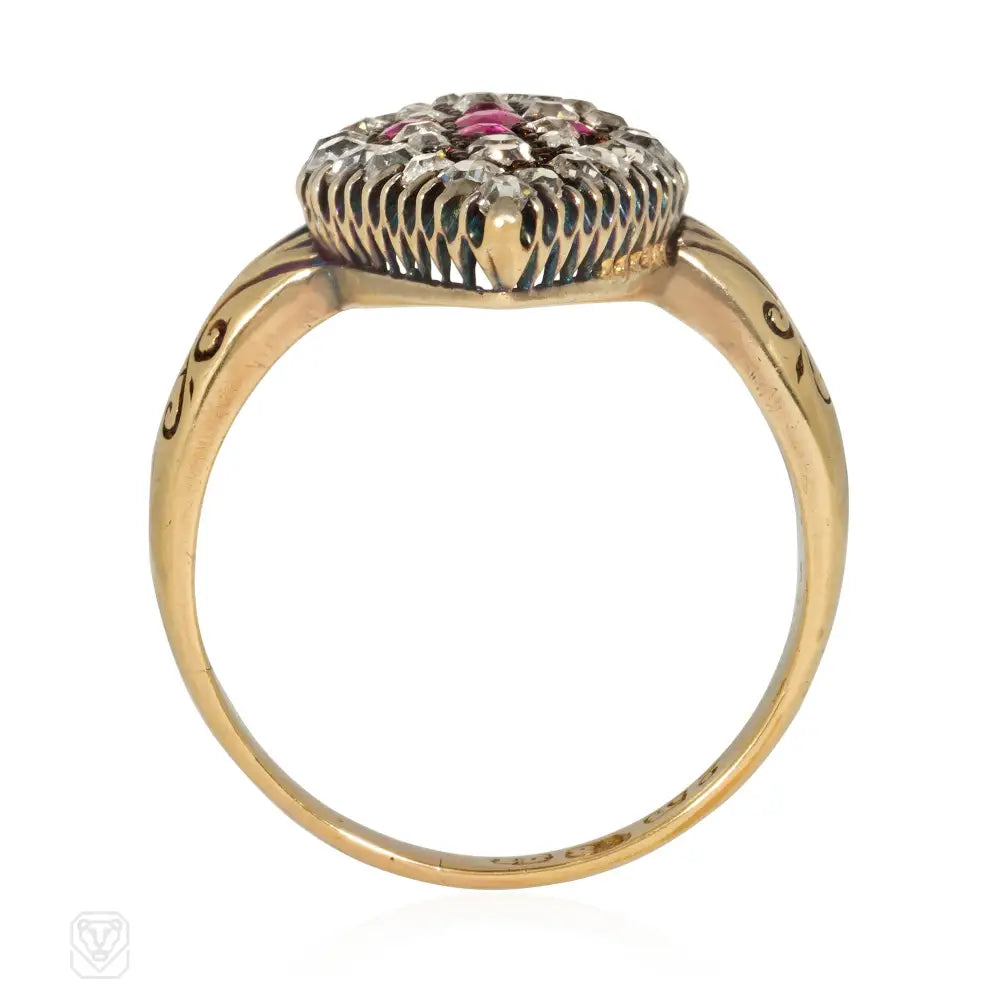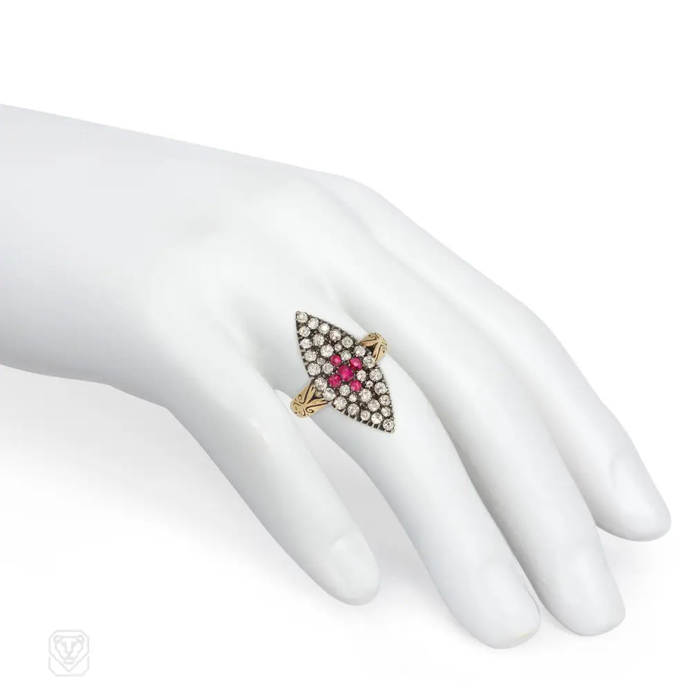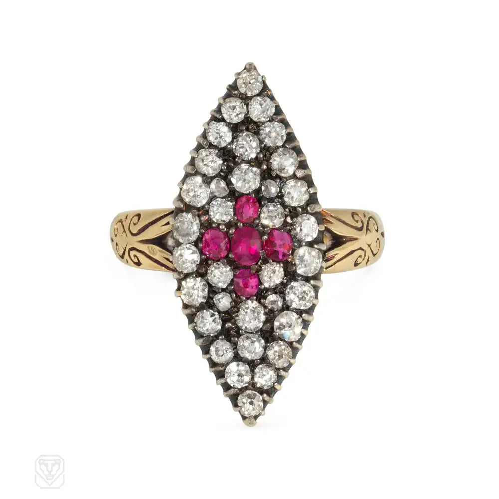 A late Victorian ring of navette-shaped design set with old-mine cut diamonds and a central maltese cross of rubies, in sterling silver and 18k. Atw diamonds 1.00 ct.