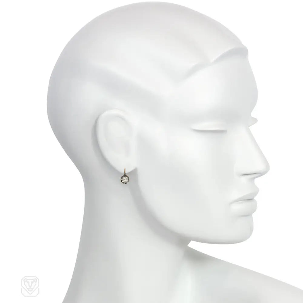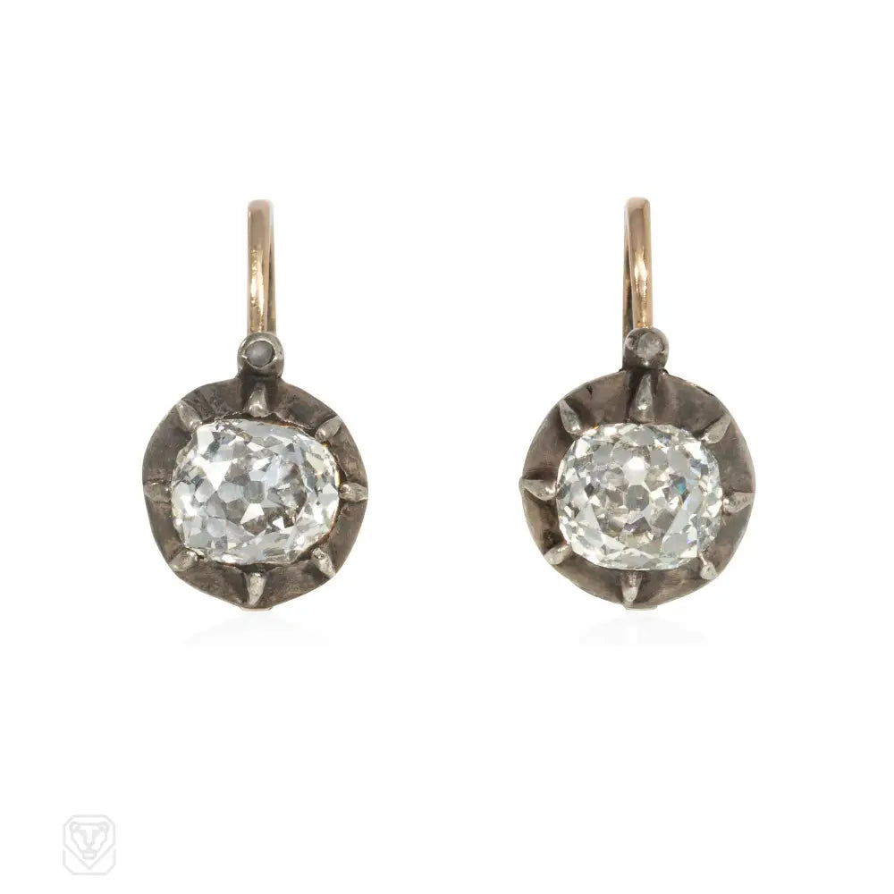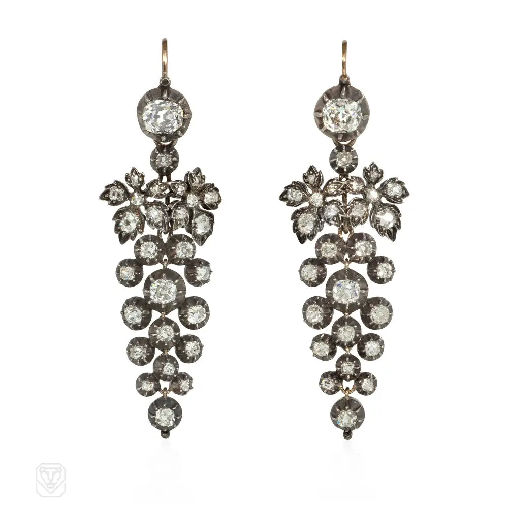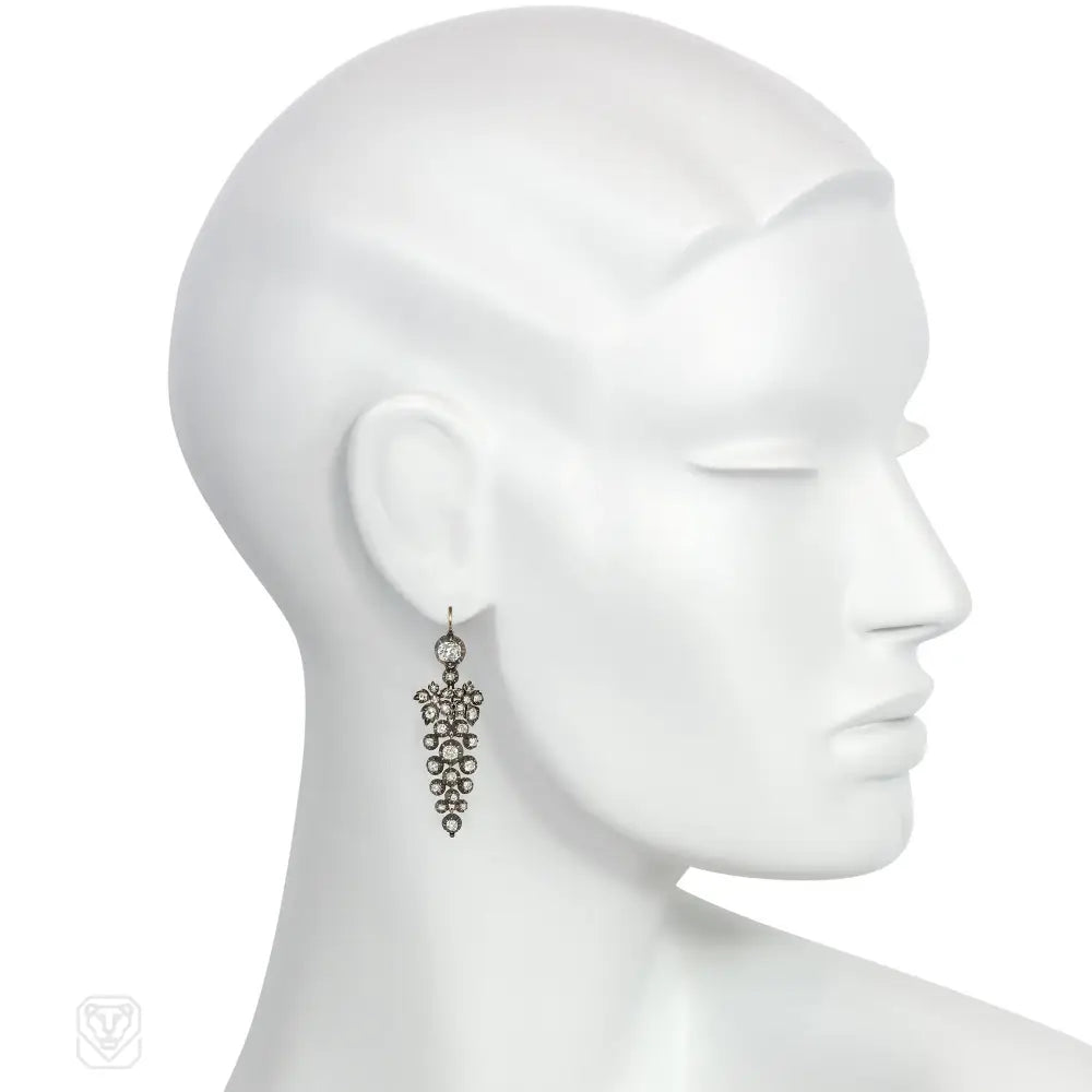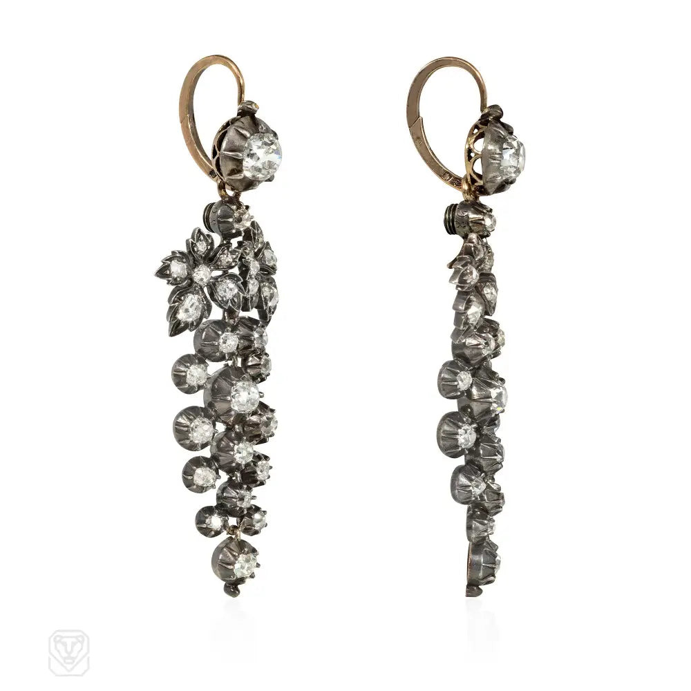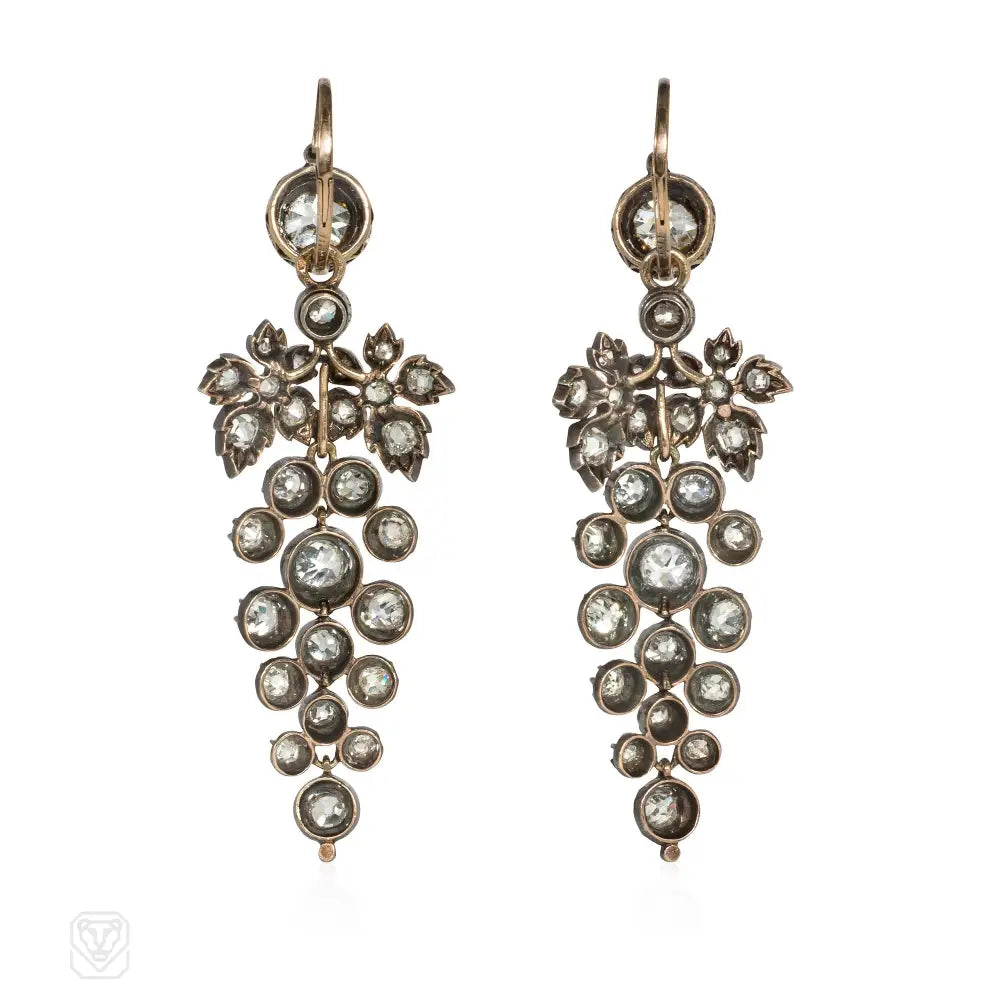 A pair of antique, day-to-night old mine cut diamond earrings with solitaire tops suspending removable articulated pendants designed as clusters of hanging grapes, in sterling silver and 18k gold. Atw 5.00 cts. (tops approximately 0.82 ct. each)
