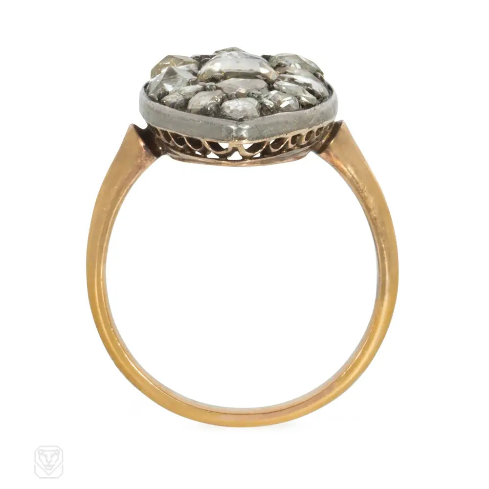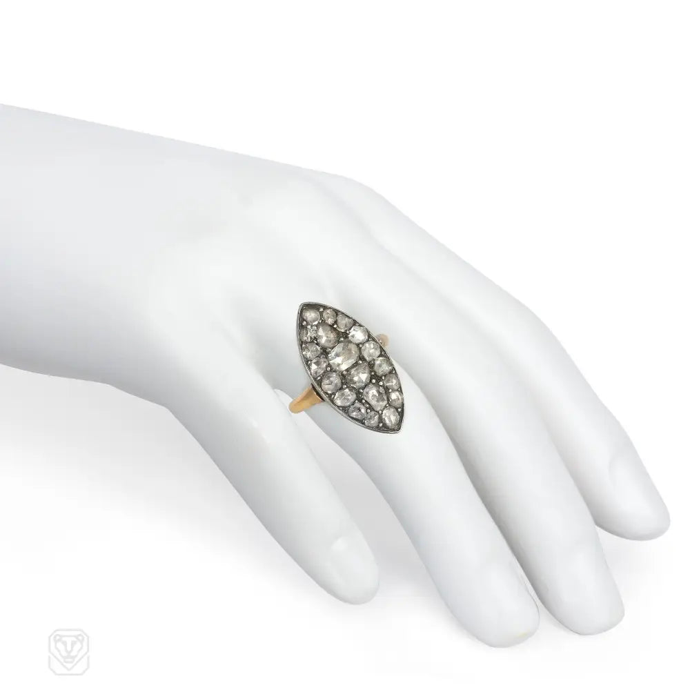 An antique navette-shaped rose diamond plaque ring in silver and 18k gold. France