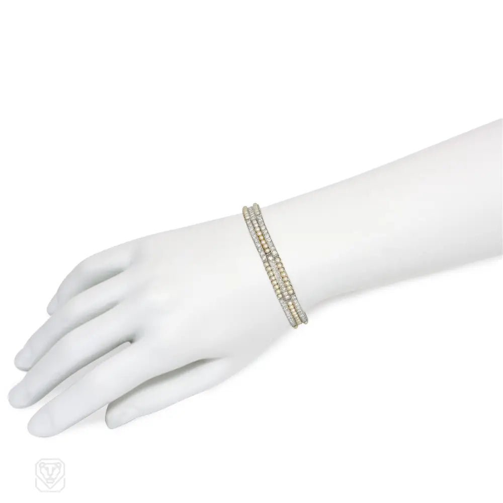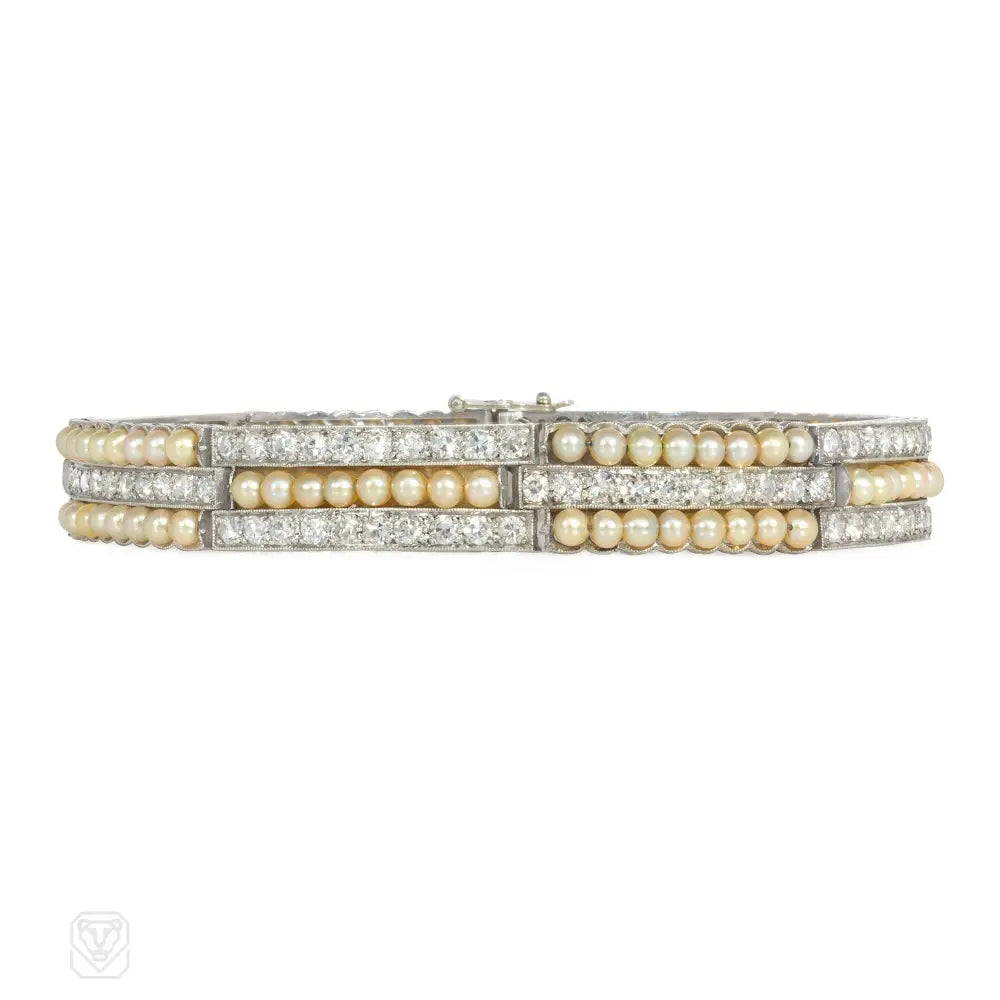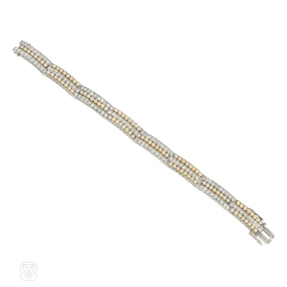 An Art Deco bracelet comprised of alternating three-row pearl and diamond plaques of striped design, in platinum. Atw single cut diamonds 3.20 cts.