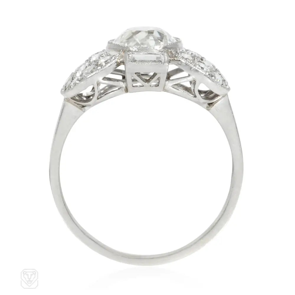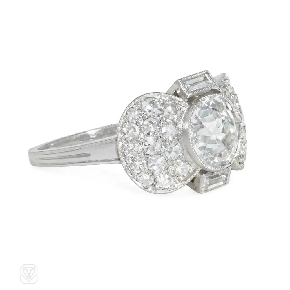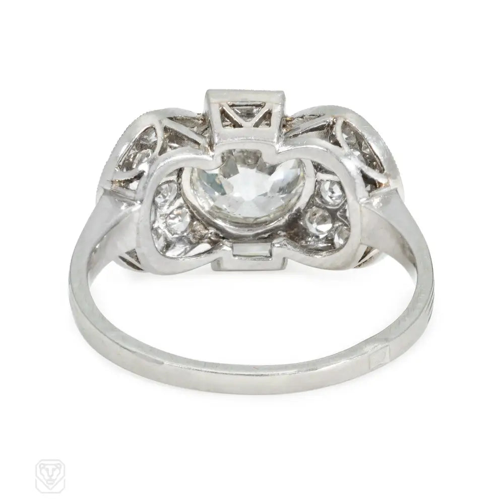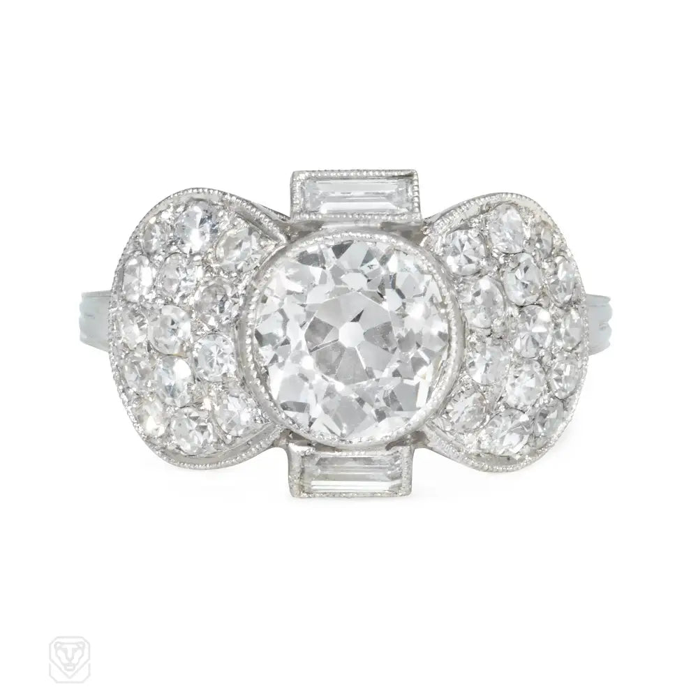 An Art Deco diamond ring of stylized bow design, centered by a collet-set old-European-cut diamond, with ovoid, pavé-diamond panels on either side and baguette-cut diamonds on top and bottom, all set within fine, millegrain borders, in platinum. French import. Approximate weight of center stone 1.35 cts., approximate total weight 2.05 cts.