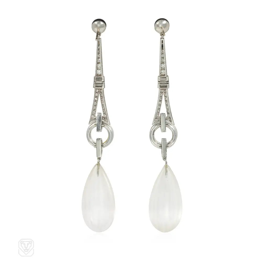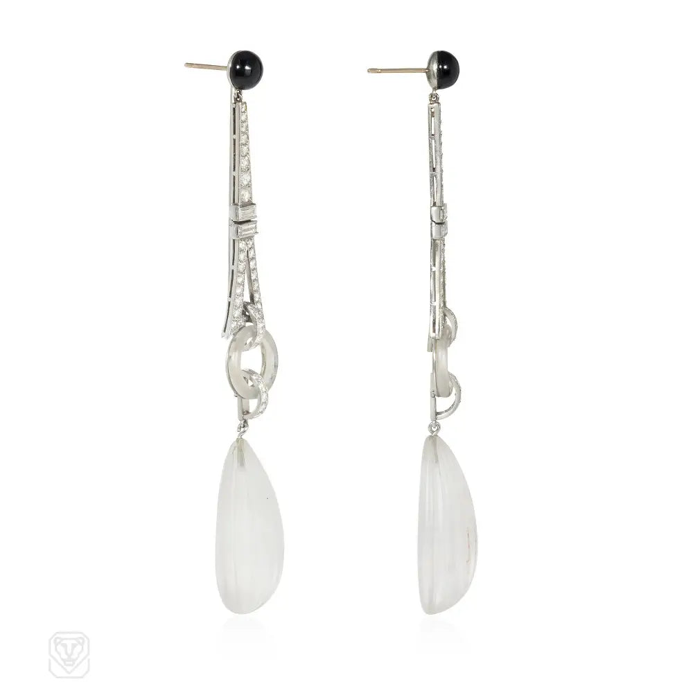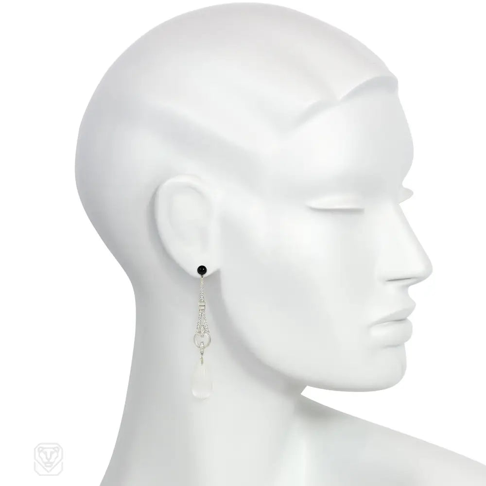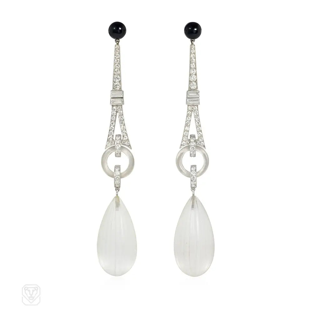 A pair of Art Deco diamond, rock crystal, and onyx earrings, surmounted by a cabochon onyx, suspending articulated, tapering, diamond-set elements terminating in rock crystal discs secured by pavé diamond half-rounds, and further suspending carved rock crystal drops, in platinum. Atw diamonds 1.33 cts.