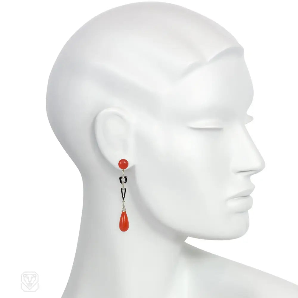 A pair of Art Deco coral, diamond, and black enamel earrings, surmounted by cabochon coral giving way to alternating columns of single-cut-set diamonds and black enamel strapwork elements, terminating in coral drops with diamond-set caps, in platinum. France.