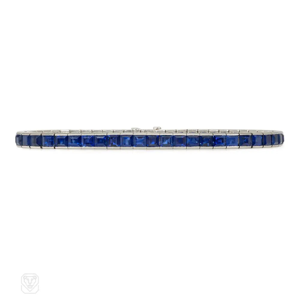 An Art Deco sapphire line bracelet comprised of square-cut sapphires, in platinum, Tiffany & Co. #56101. Atw sapphires 8.00 cts.