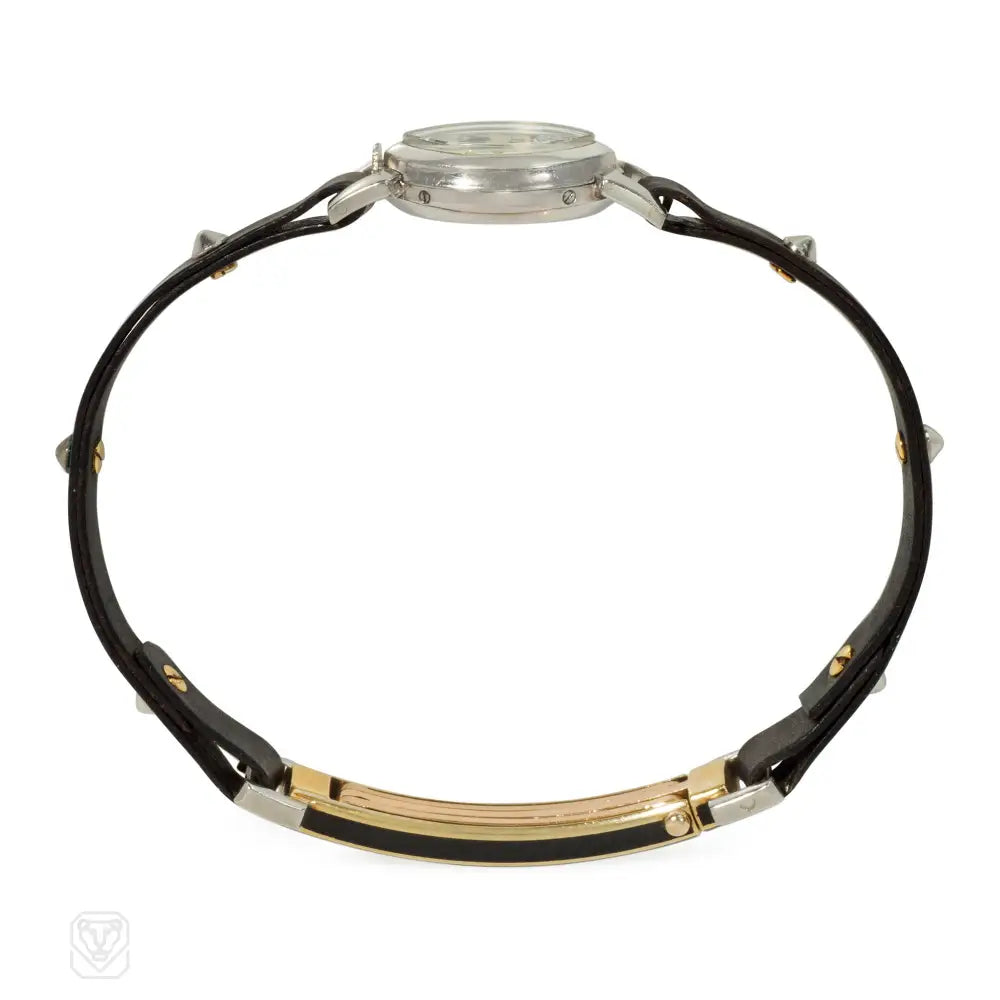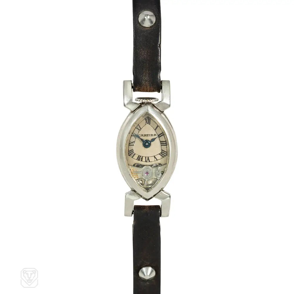 An Art Deco "Amande" watch with a visible balance and spade-shaped, blued steel hands accompanied by a studded strap with original deployante closure, in platinum; featuring a rhodiumed, 17 jewel-jewel movement by EWC, with lateral lever escapement, cut bimetallic balance, and flat balance-spring. Cartier, Paris. #24788. Signed on dial, case, and movement.
