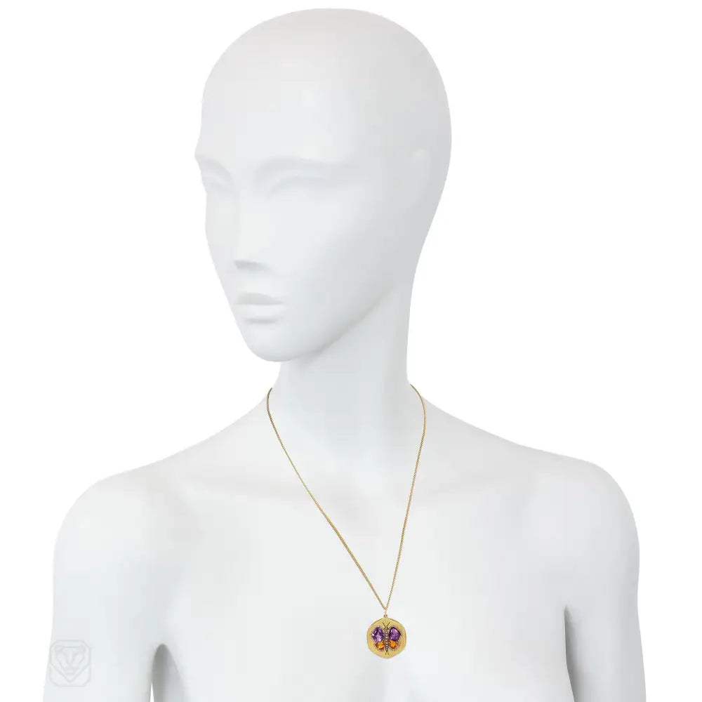 Art Nouveau amethyst, citrine, and diamond butterfly pendant