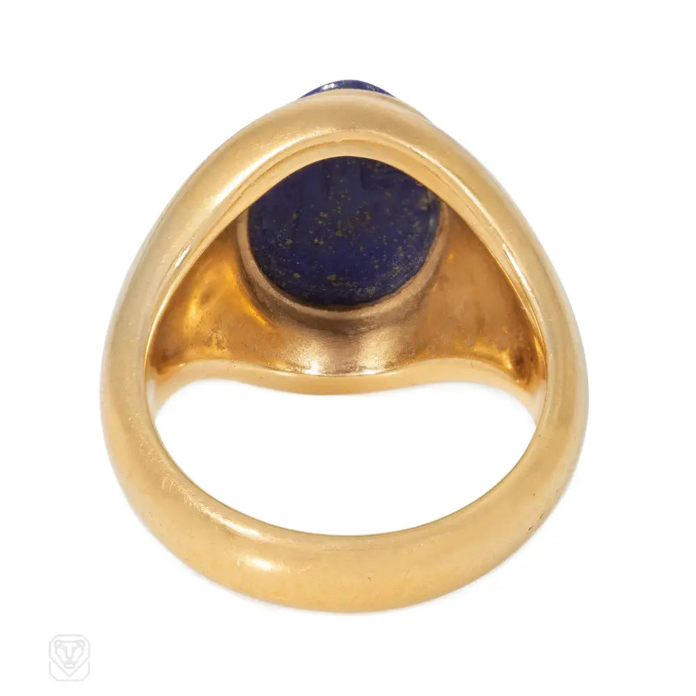 A lapis and gold ring, centered by an oval, bezel-set, carved lapis scarab, in 18k. Cartier. #05551.