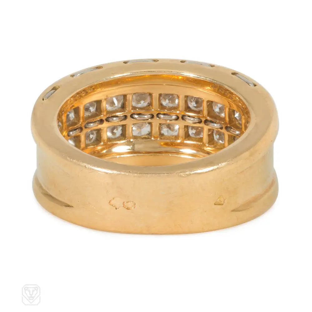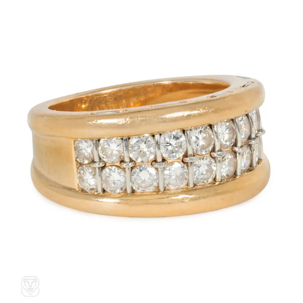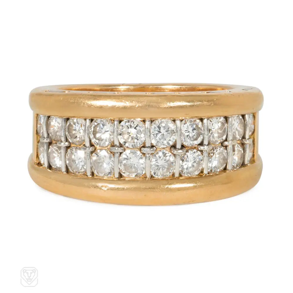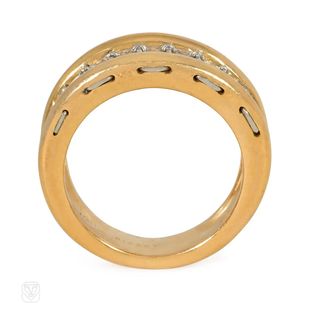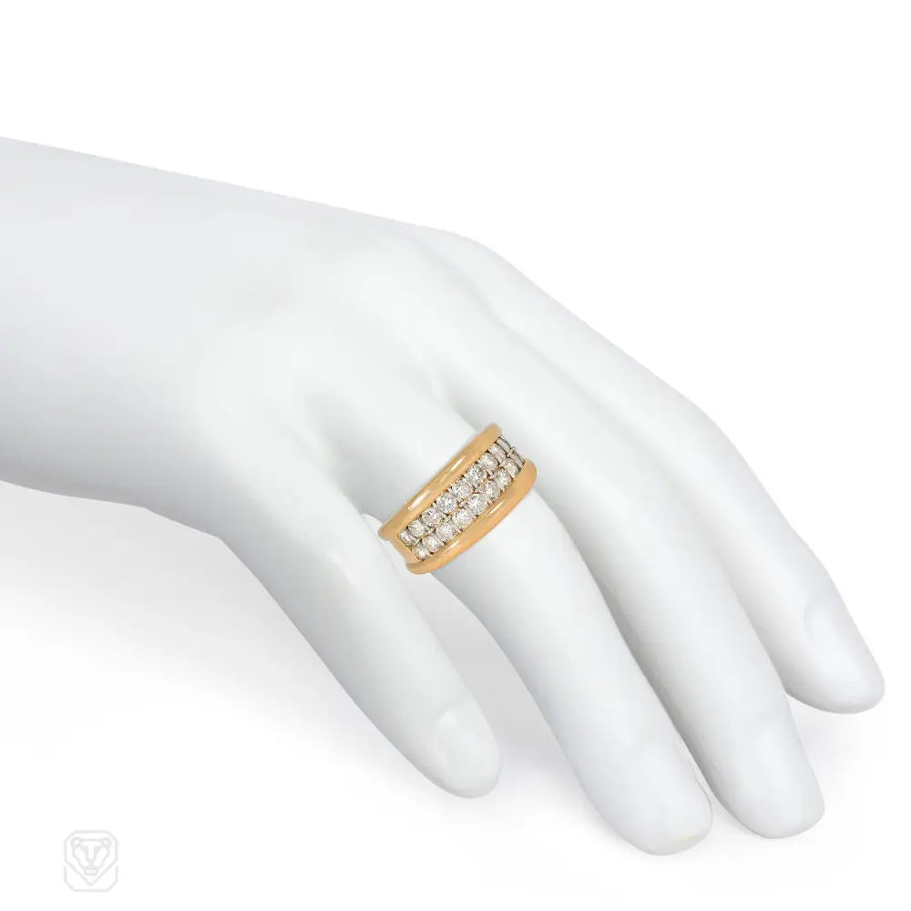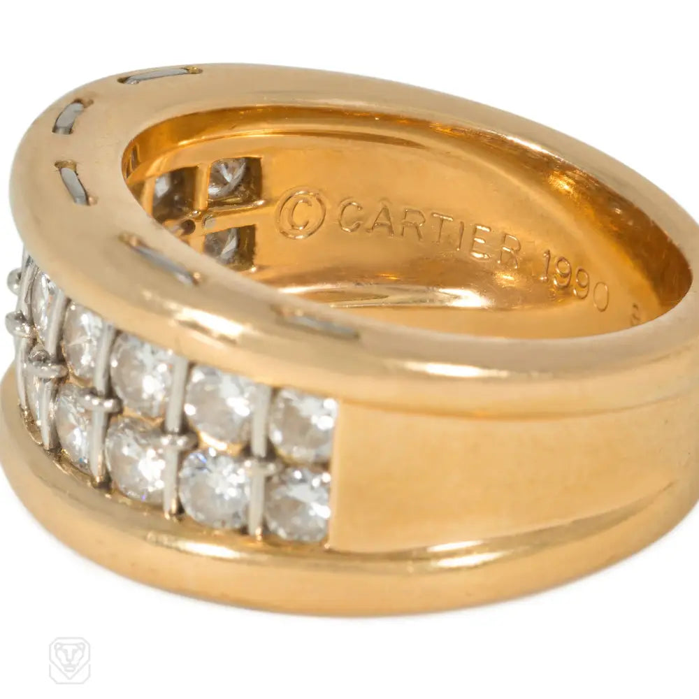 A two-row diamond ring with shared settings and raised gold borders in 18k and platinum. Atw diamonds 1.12 cts. Cartier, Paris. 916357.