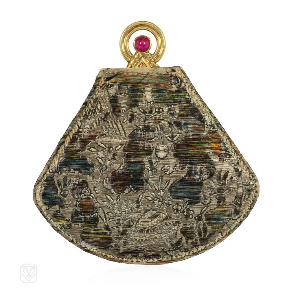 A Retro gold fan-shaped hand mirror with engraved design and twisted borders, set with a cabochon ruby, in 18k. Cartier, #795. Original silk fitted case.