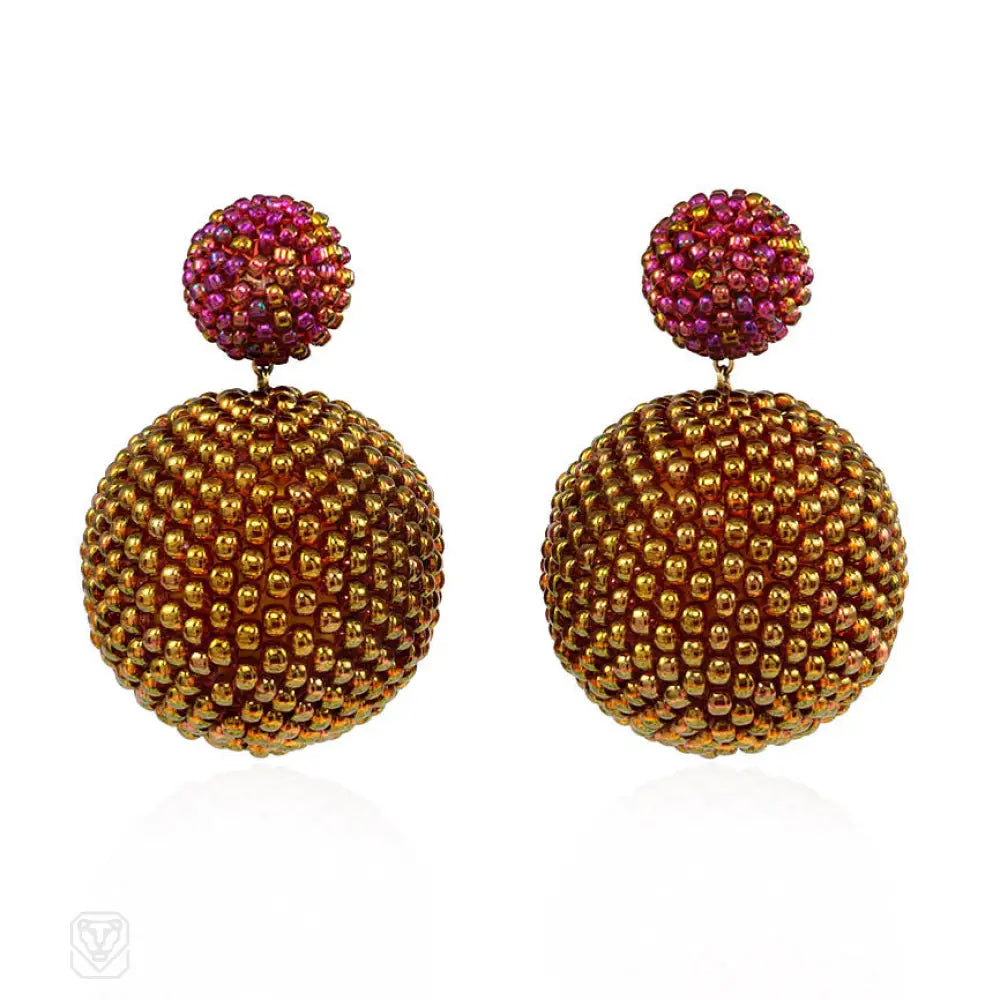 A pair of handmade glass bead earrings with cinnamon tops and large amber gold luster bottoms, in 14k gold. Axel Russmeyer. AVAILABLE FOR ORDER; PLEASE CONTACT US FOR DETAILS.