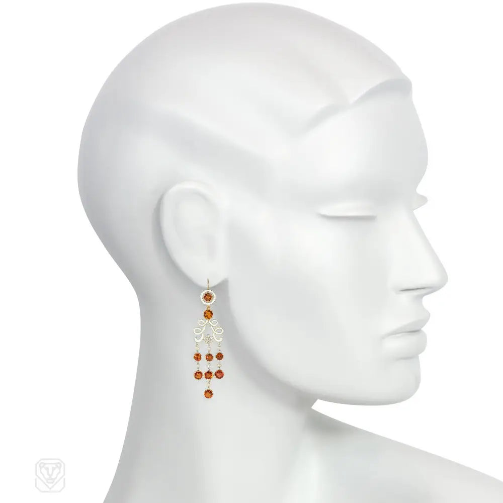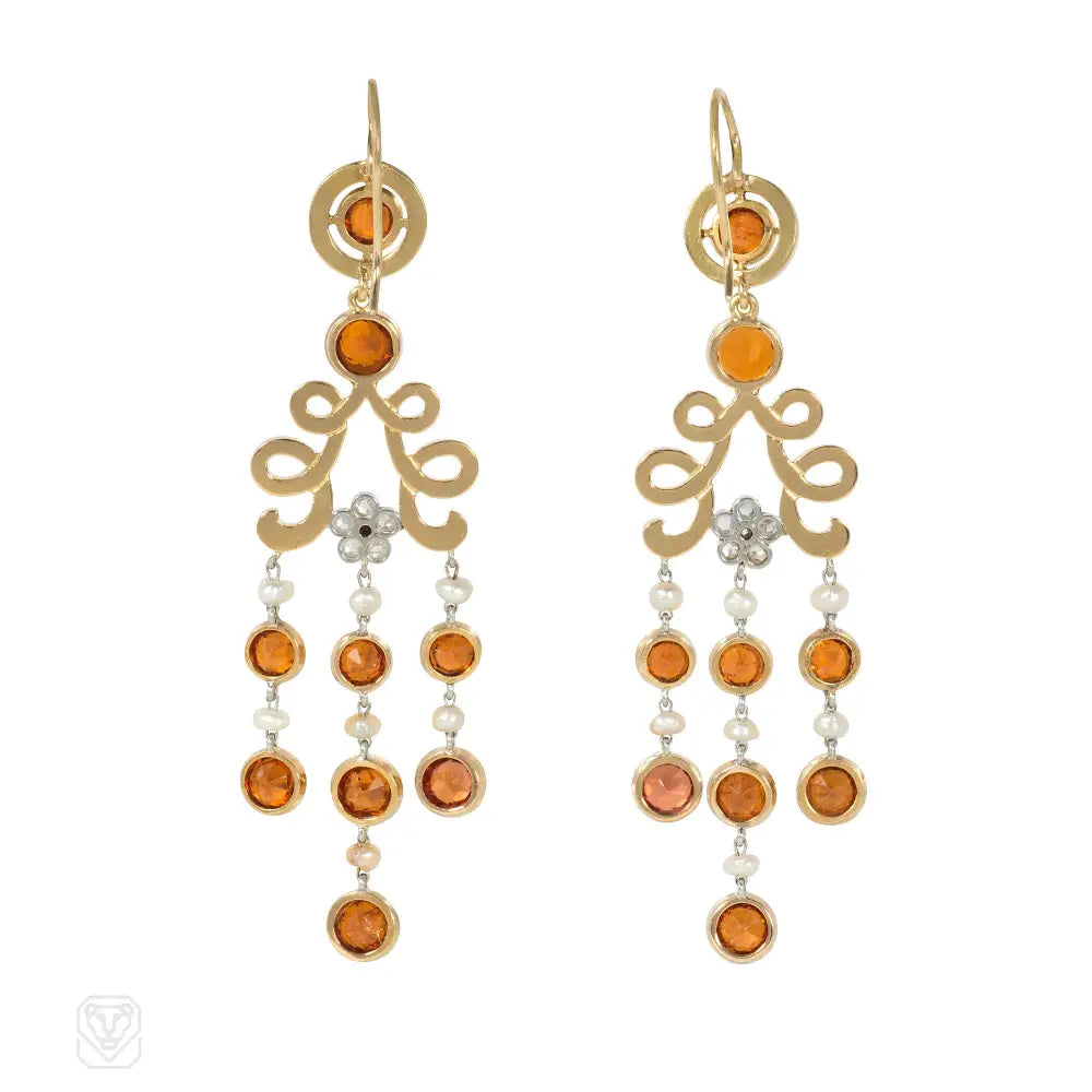 A pair of Edwardian pendant earrings of girandole design with collet-set garnets and seed pearls cascading from scrolled white enamel surmounts with a diamond florette spacer, in 18k gold and platinum.