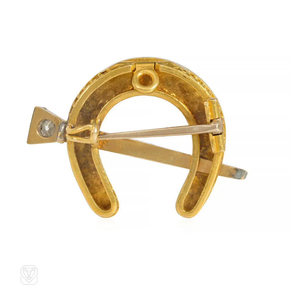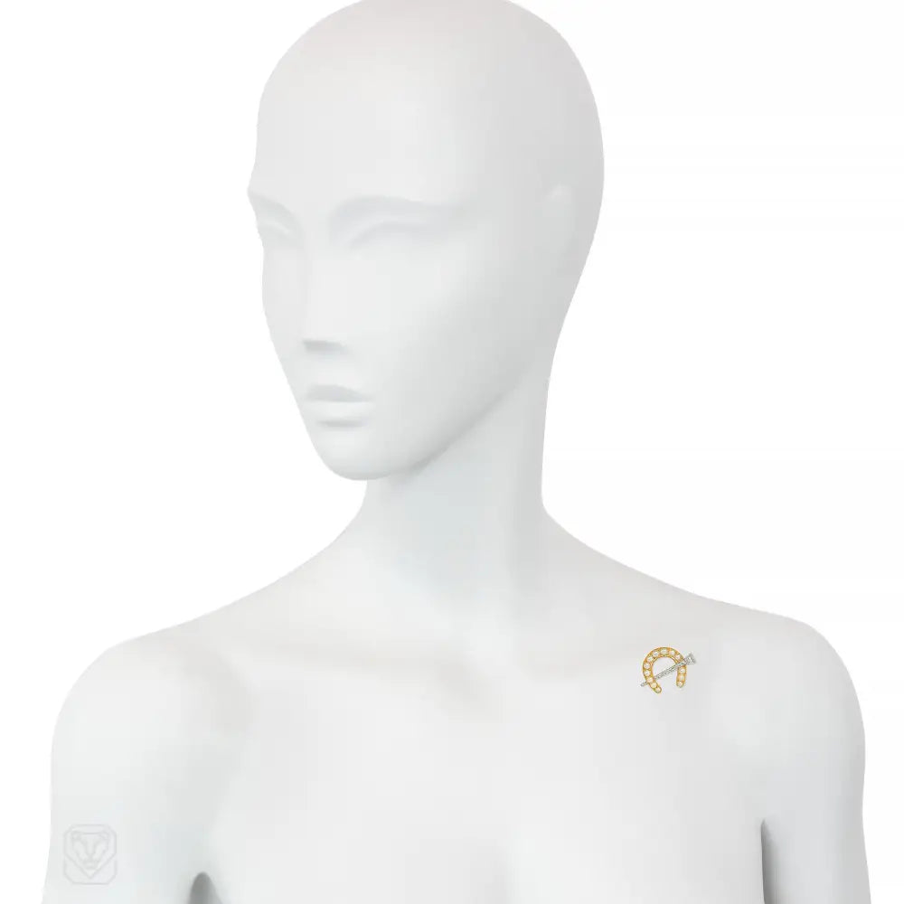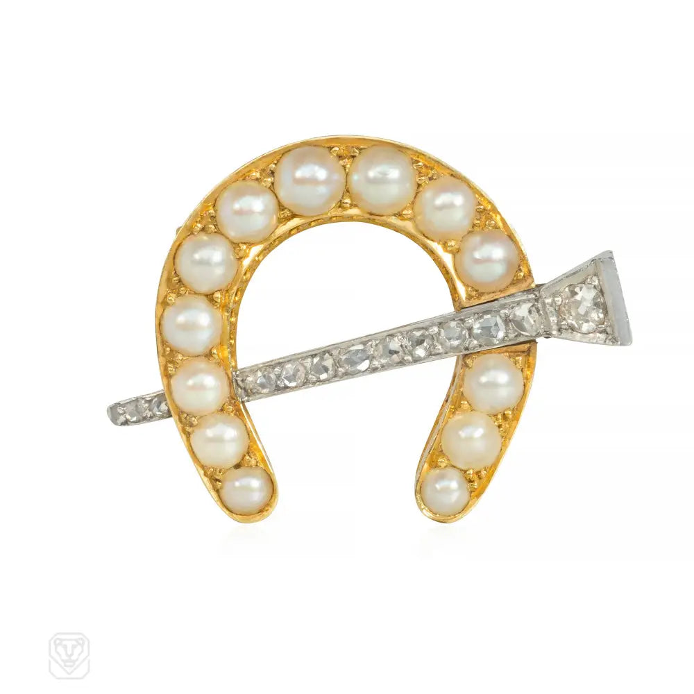 An Edwardian brooch in the form of a pearl-studded horseshoe pierced by a pavé diamond spike, with pendant loop, in 18k gold and platinum.