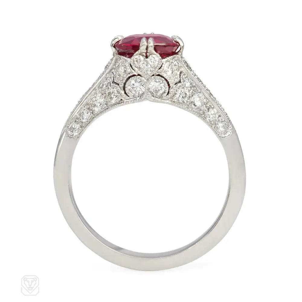 An oval ruby ring in Edwardian style mount with diamond accents, in platinum. Sebastien Barier, France