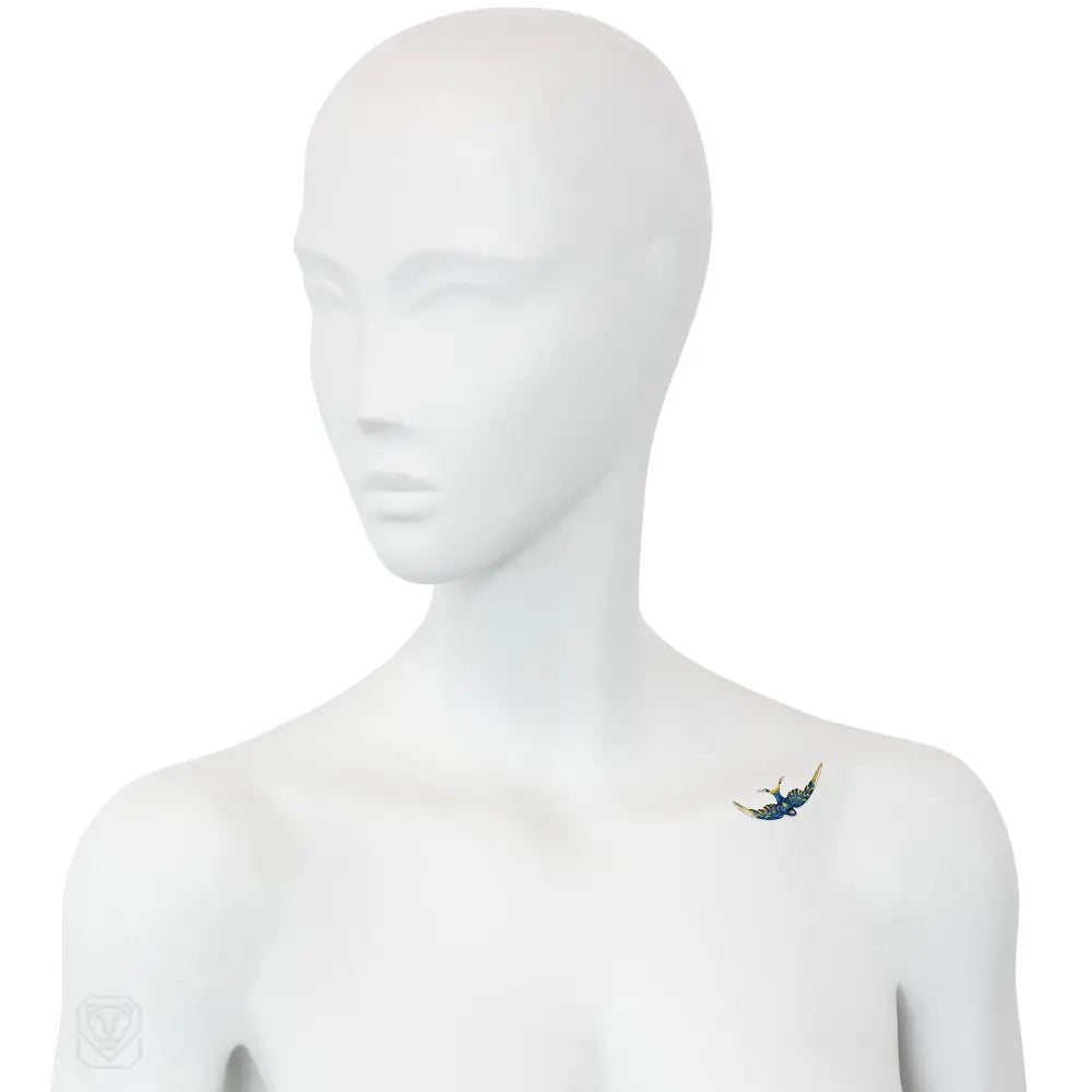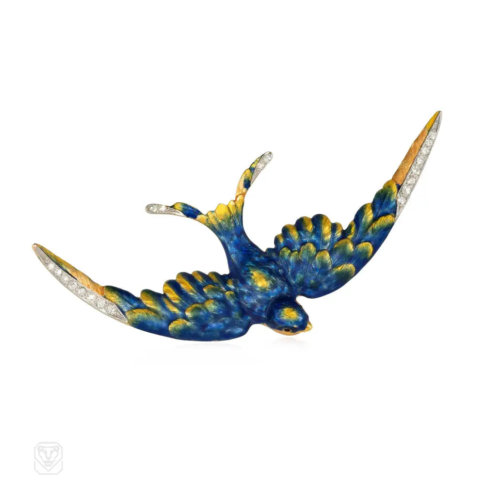An Art Nouveau gold and diamond brooch with blue and yellow enameling in the form of a winging swallow, in 14k.