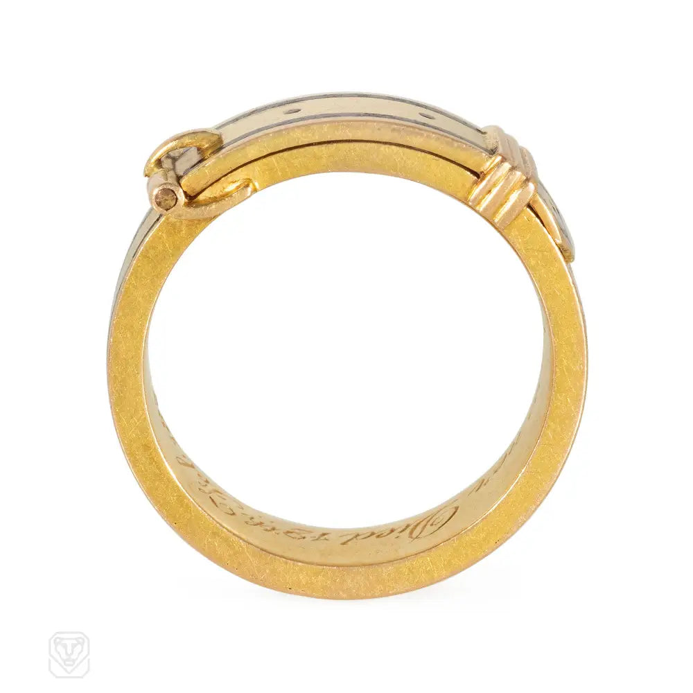 A Victorian gold mourning ring designed as a buckled garter, with black enamel decoration and with a concealed locket under the strap, in 15k. England.
