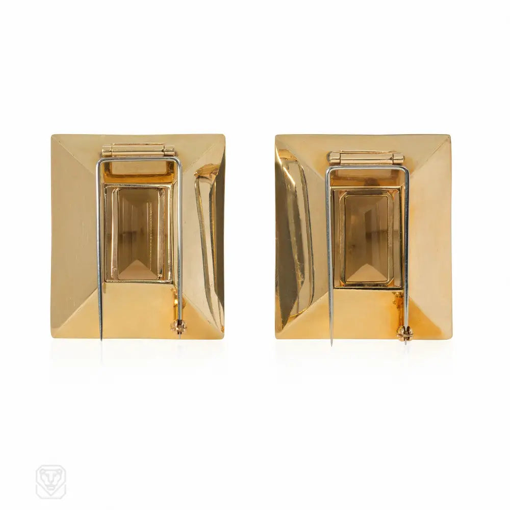 A pair of Retro citrine and gold clip brooches centered by prong-set, emerald-cut citrines inside rectangular, beveled gold borders in 14k. Trabert, Hoeffer, and Mauboussin. Atw citrines 55.00 cts. and 57.00 cts., respectively