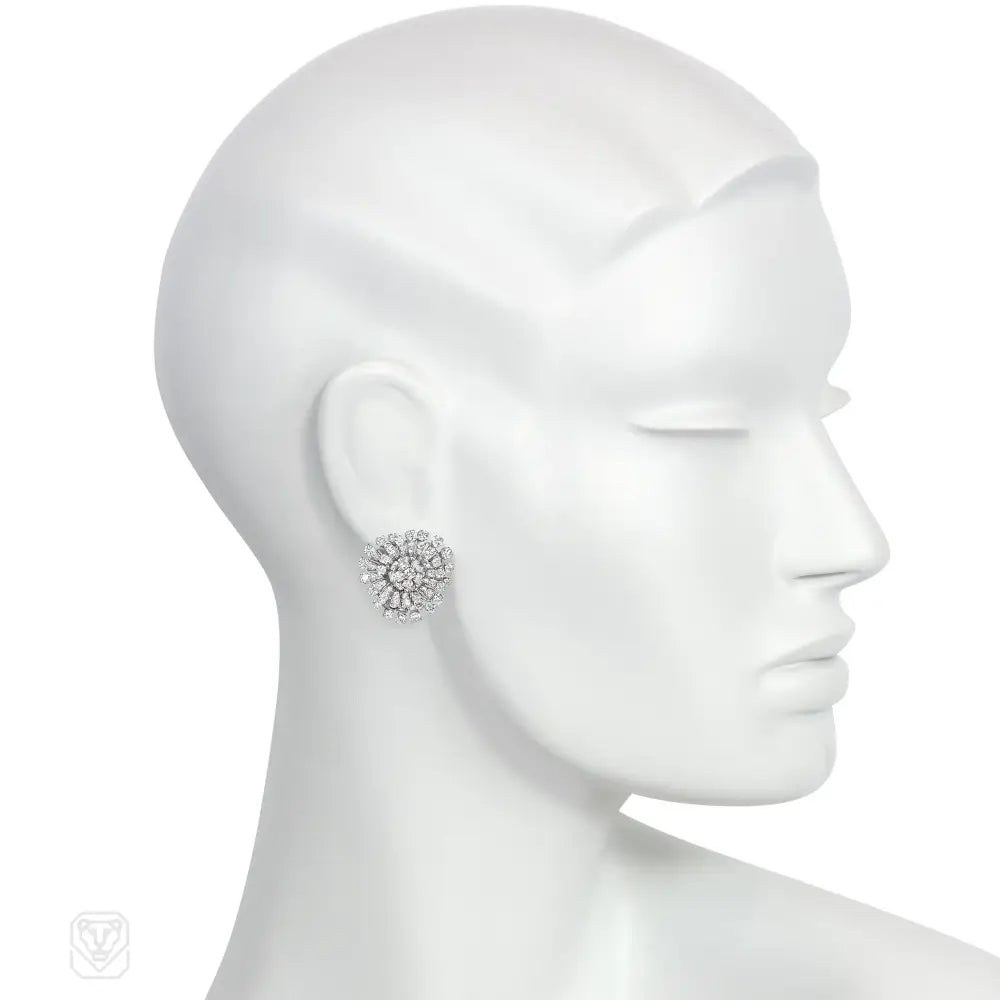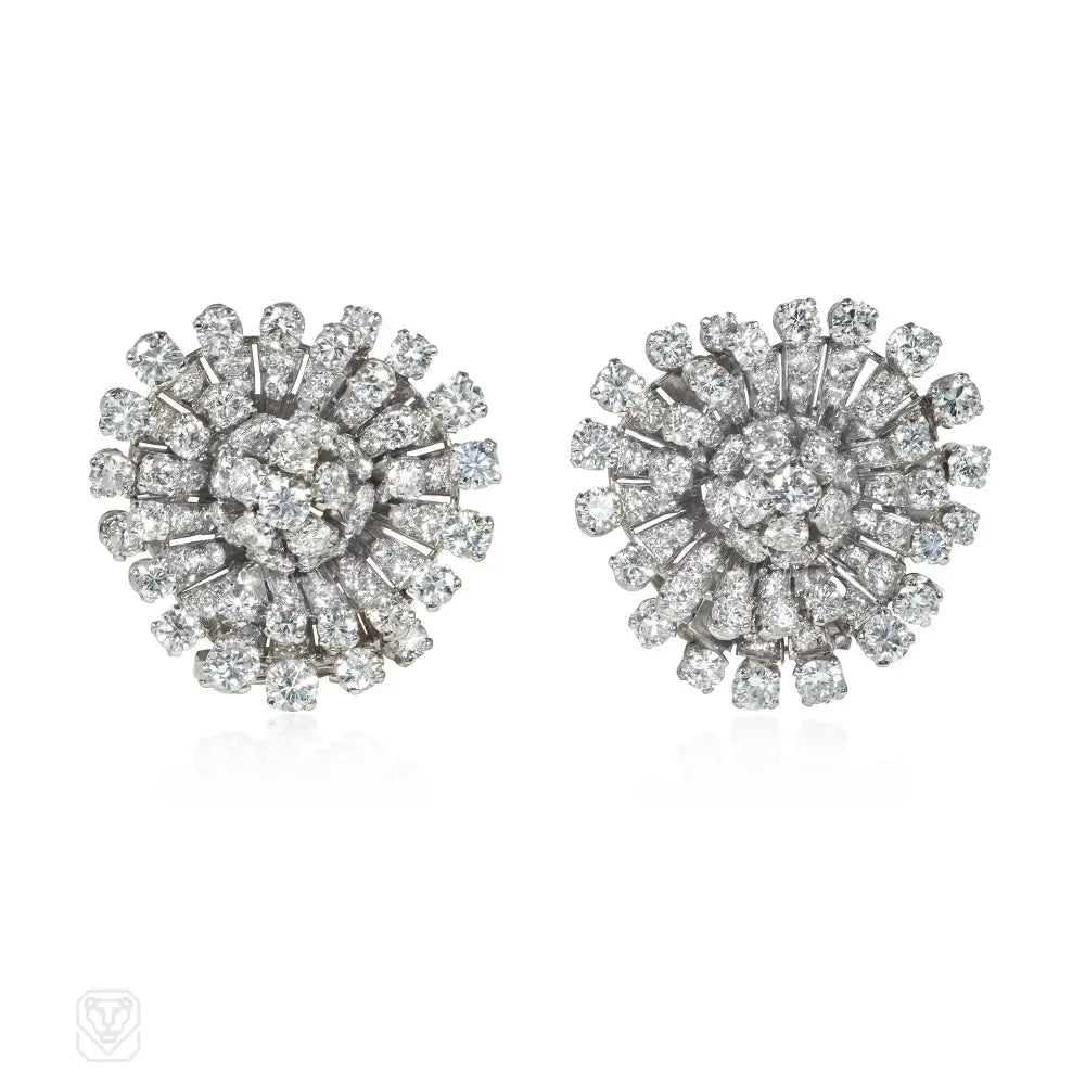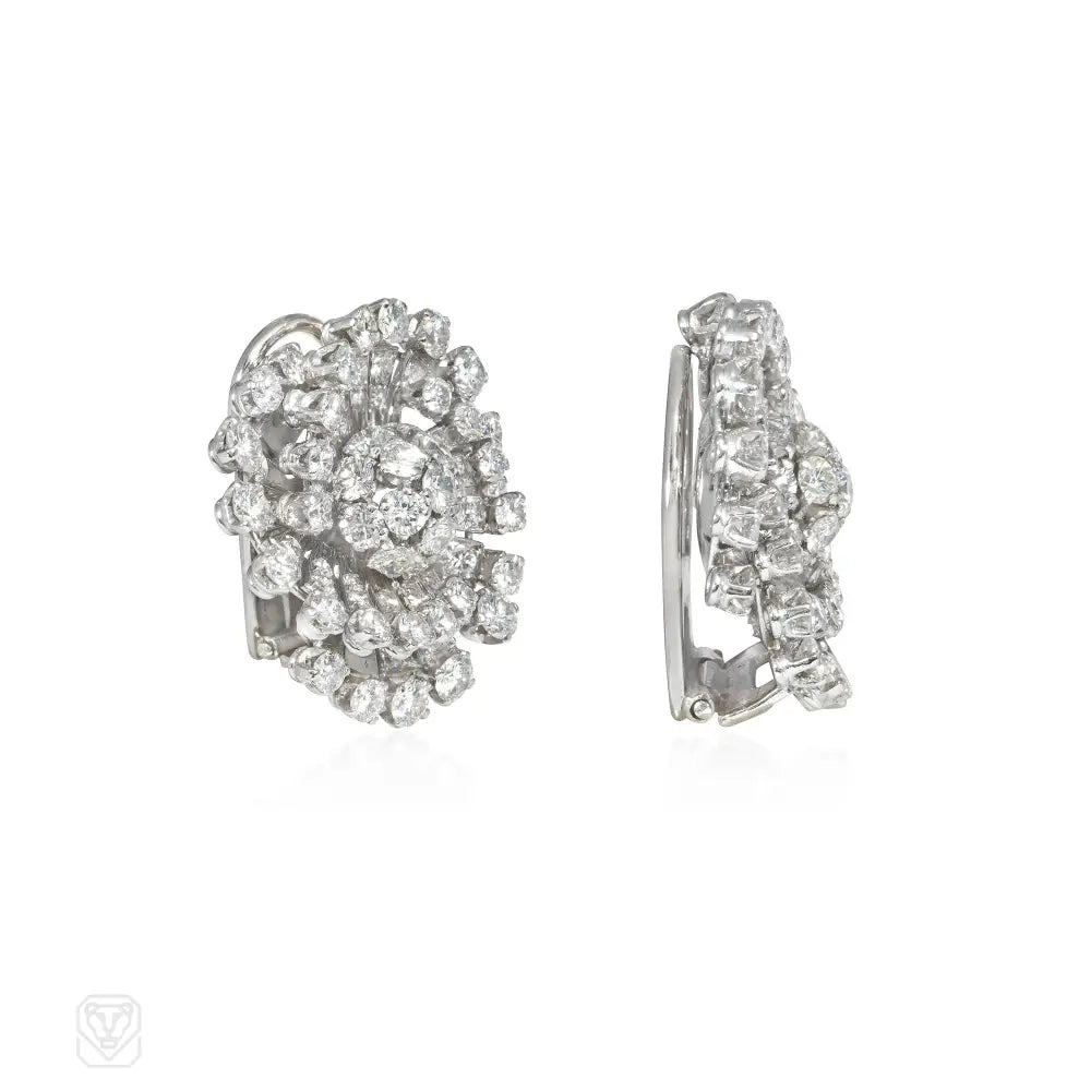 A pair of Mid-Century diamond swirl clip earrings in the form of stylized flowers, with half-round pavé diamond centers, in platinum. Atw 7.00 cts.