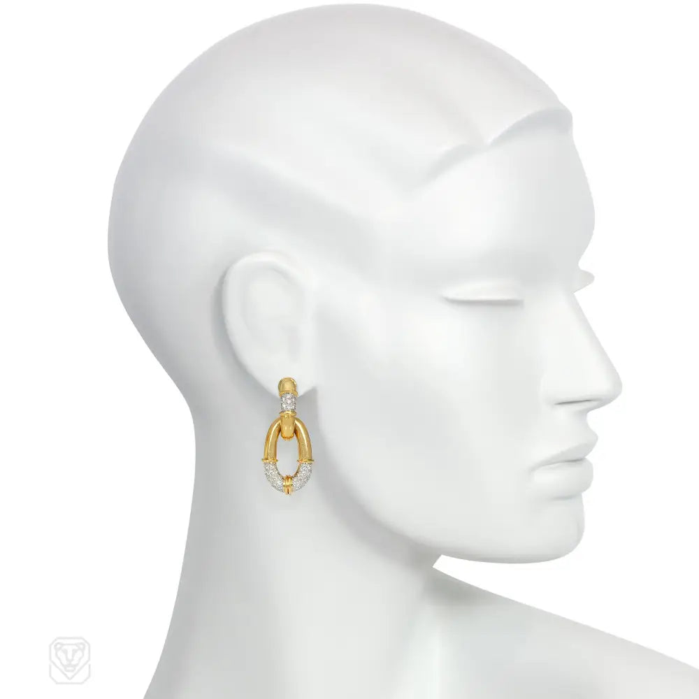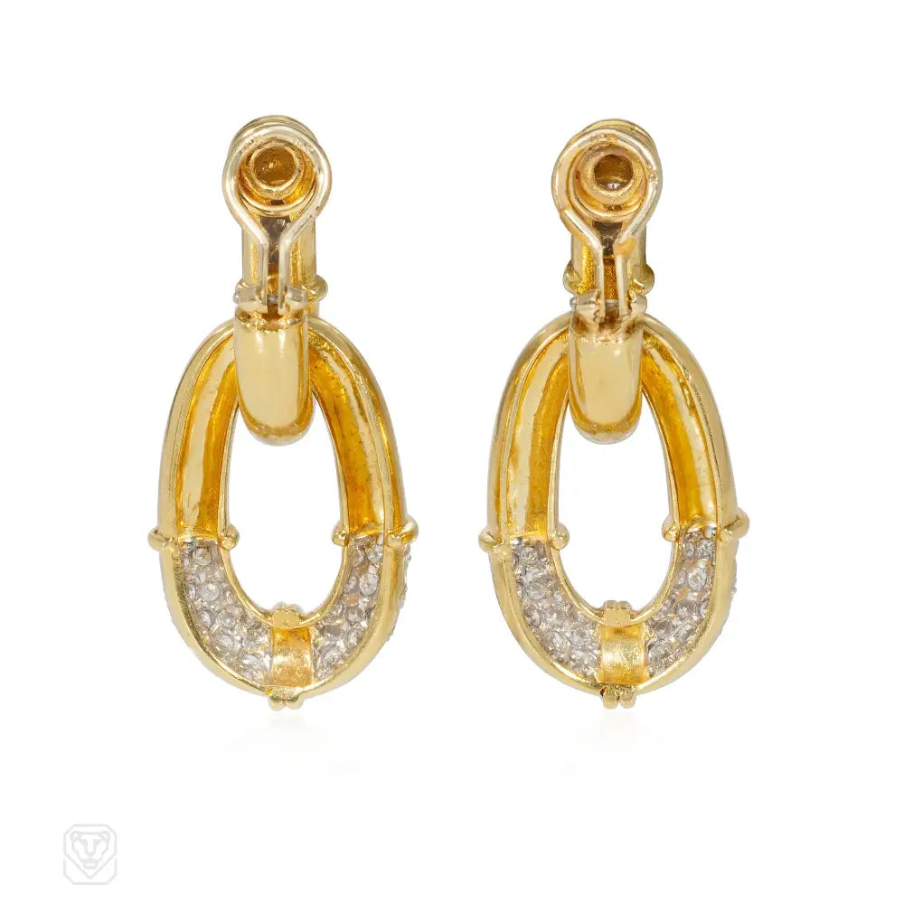 A pair of gold and pavé, diamond, day-to-night doorknocker earrings of oblong design, in 18k and platinum. Atw diamonds 2.25 cts.