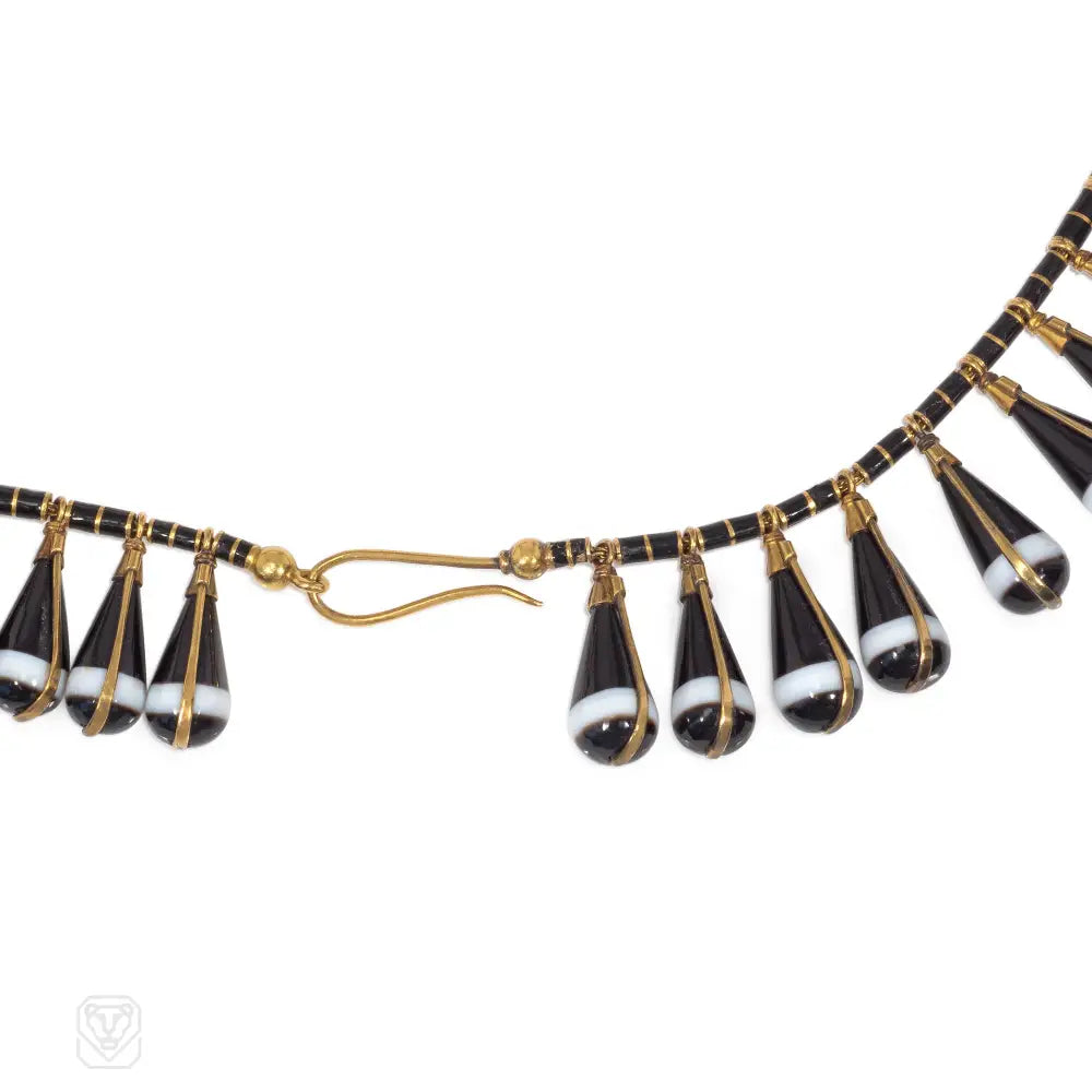 A Victorian banded agate, gold, and enamel fringe necklace comprised of banded agate drops separated by black enamel and gold spacers, with a wire hook closure, in 14k.