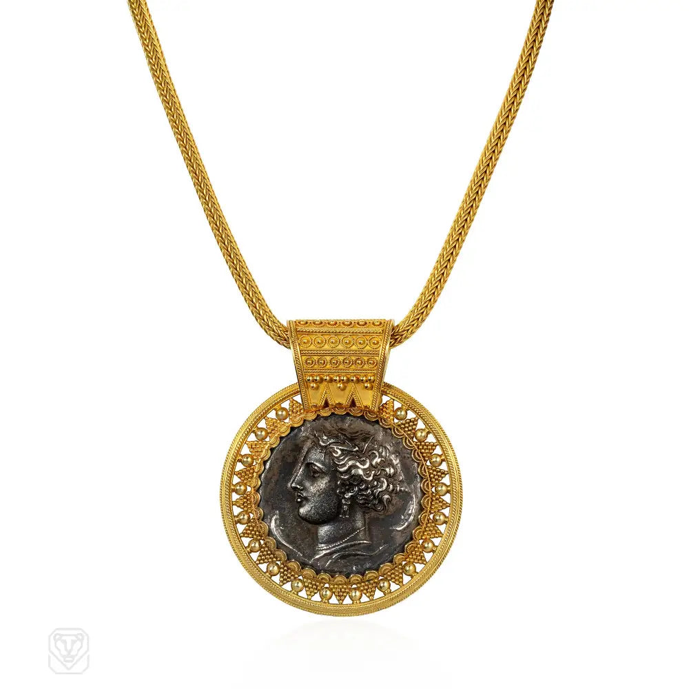 A Victorian Etruscan Revival gold and silver "bulla" coin necklace, centered by a 19th century reproduction of a Decadrachm of Syracuse coin, by Euainetos, set within a pierced border of alternating gold beads and granulated triangles, with a ropetwist edge, surmounted by a fixed, granulated bale, and suspended from a wheat sheaf chain, terminating in a ribbed, barrel clasp, in 18k. Stamped "CG" on chain and pendant for Carlo Giuliano, England.