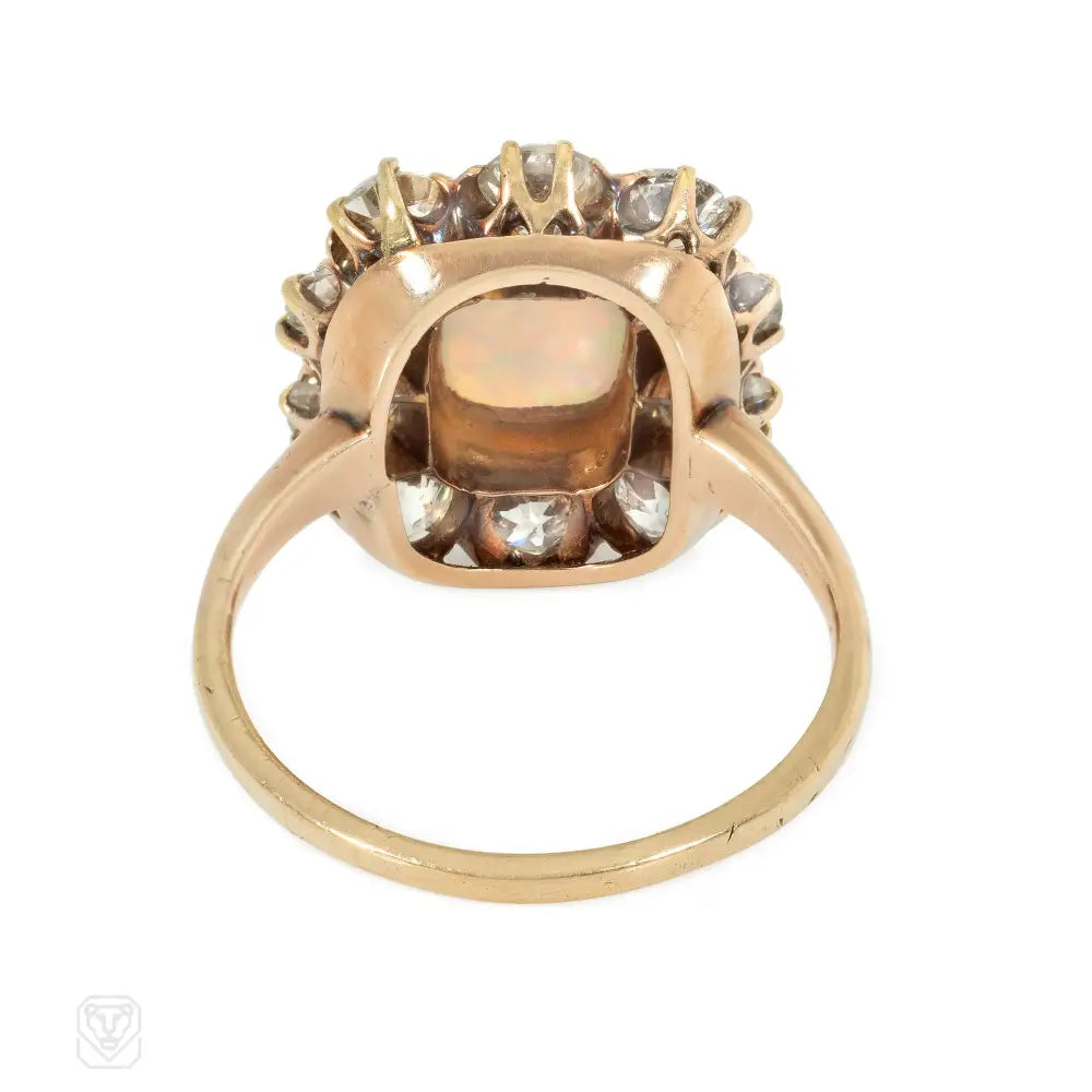 A Victorian gold ring comprised of an opal cushion cabochon in a European-cut diamond surround, in 14k. Opal atw 2.5ct, Dia atw 3.5ct