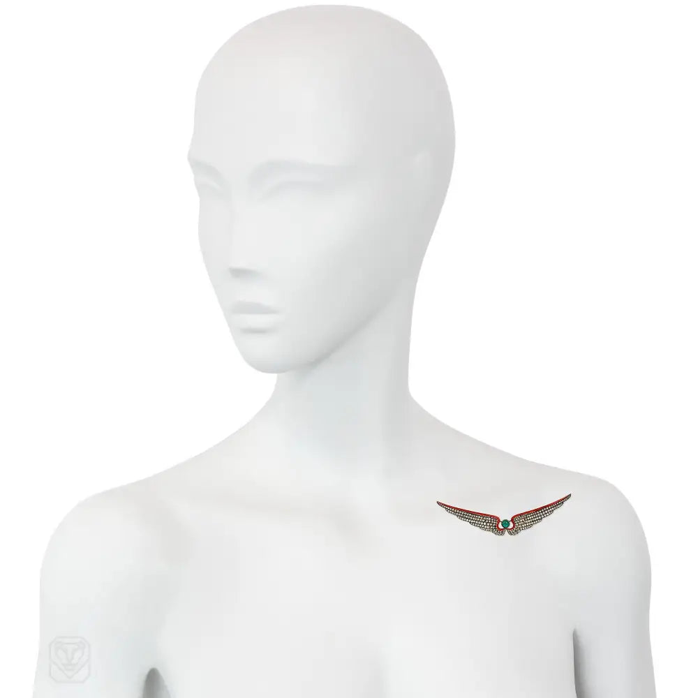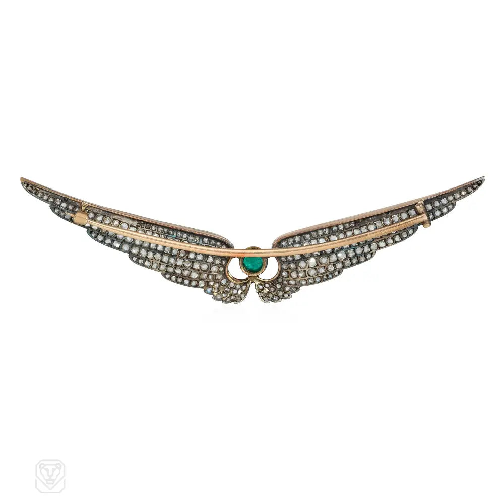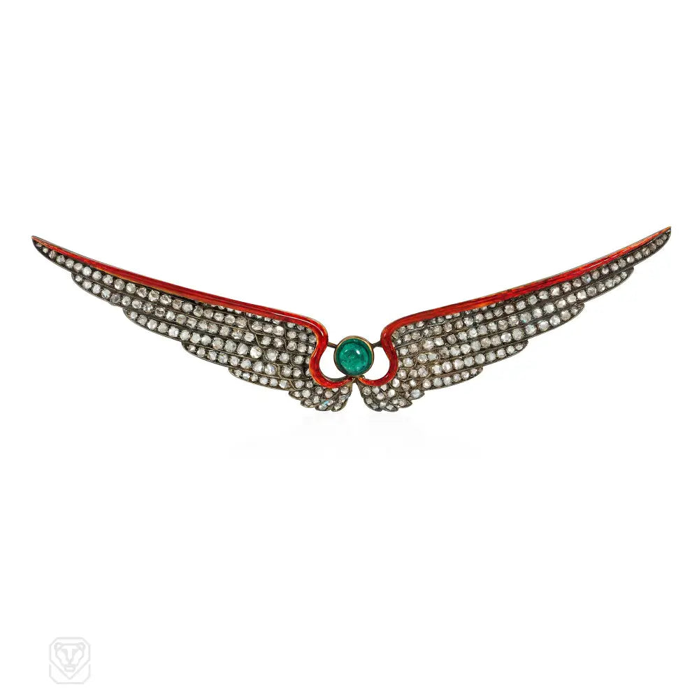 A Victorian diamond brooch designed as a pair of outstretched wings with an auburn enamel border and centering on a cabochon emerald, in sterling silver and 14k gold.
