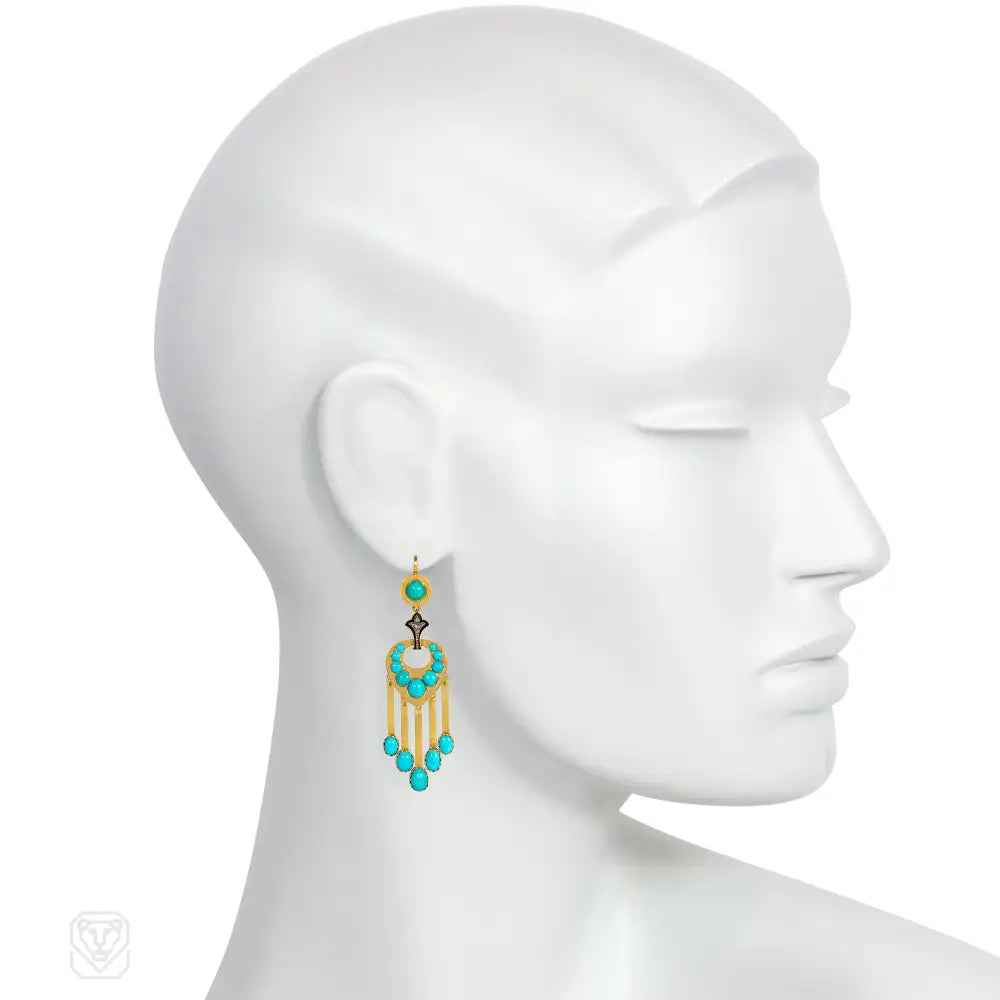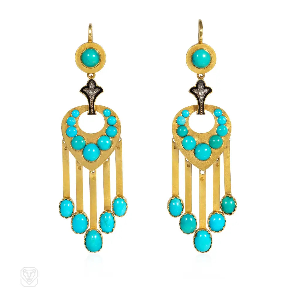 Antique French turquoise, diamond and enamel pendant fringe earrings