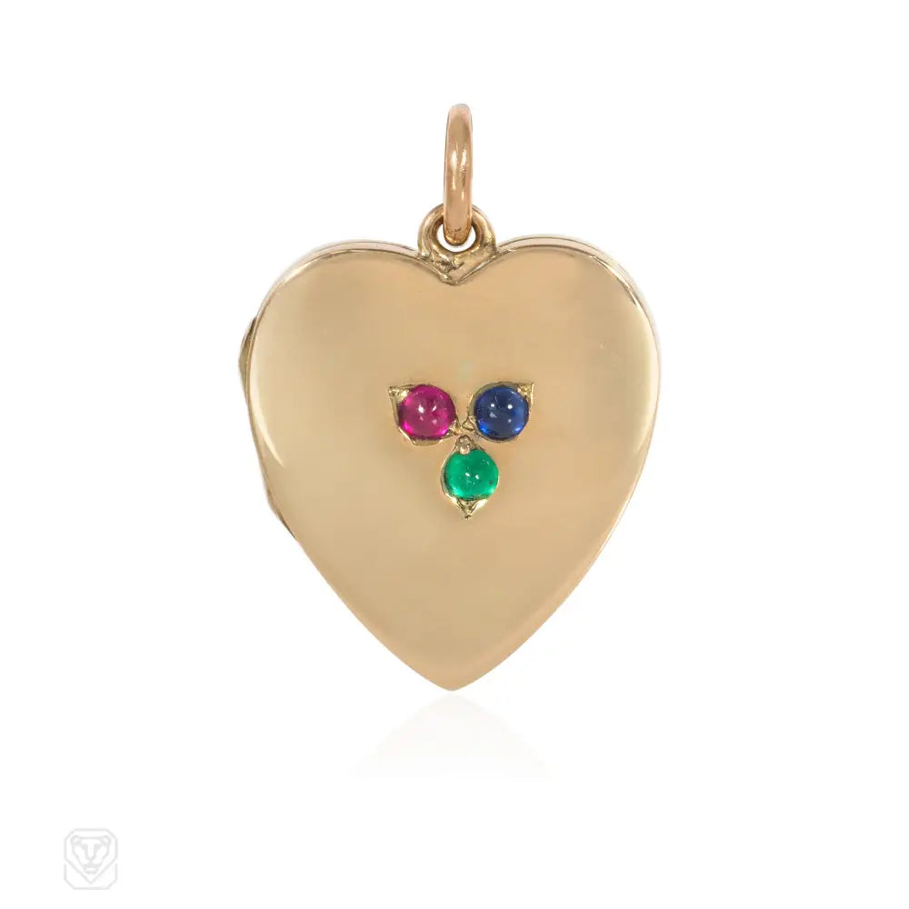 A Victorian gold heart locket set with cabochon ruby, emerald, and sapphire trefoil motif, in 15k.