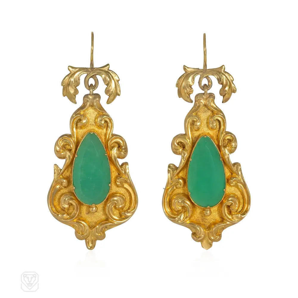 A pair of Georgian gold pendant earrings comprised of drop-shaped chrysoprase within a repoussé frame of foliate design, in 15k. England