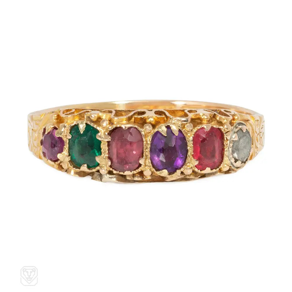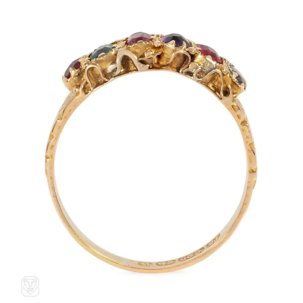 A Victorian acrostic "Regard" ring comprised of ruby, emerald, garnet, amethyst, ruby and diamond, in 15k gold. England.