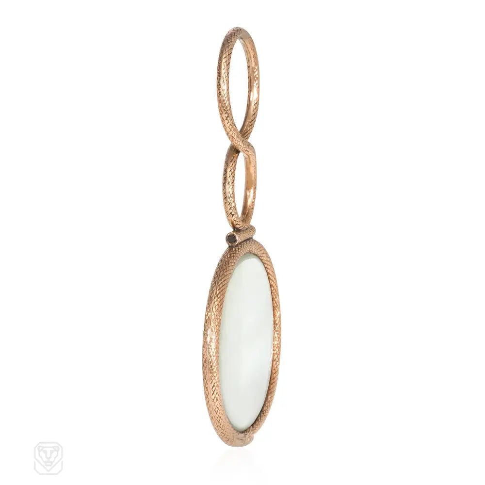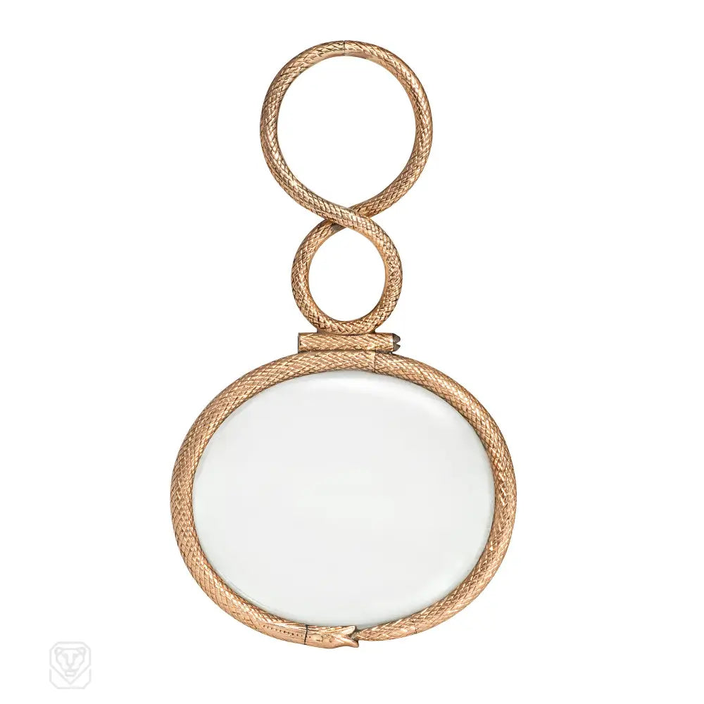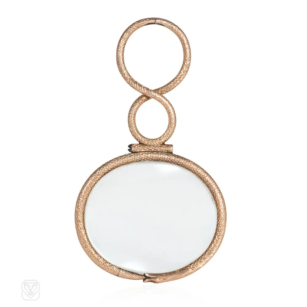 A Georgian gold quizzing glass designed as an ouroboros snake surrounding a crystal lens with a bale designed as its slithering body, in 15k. England