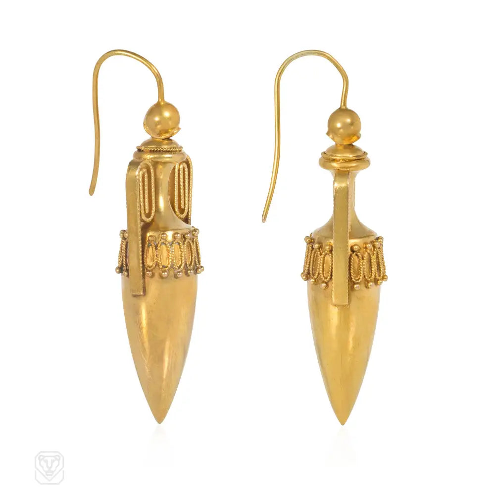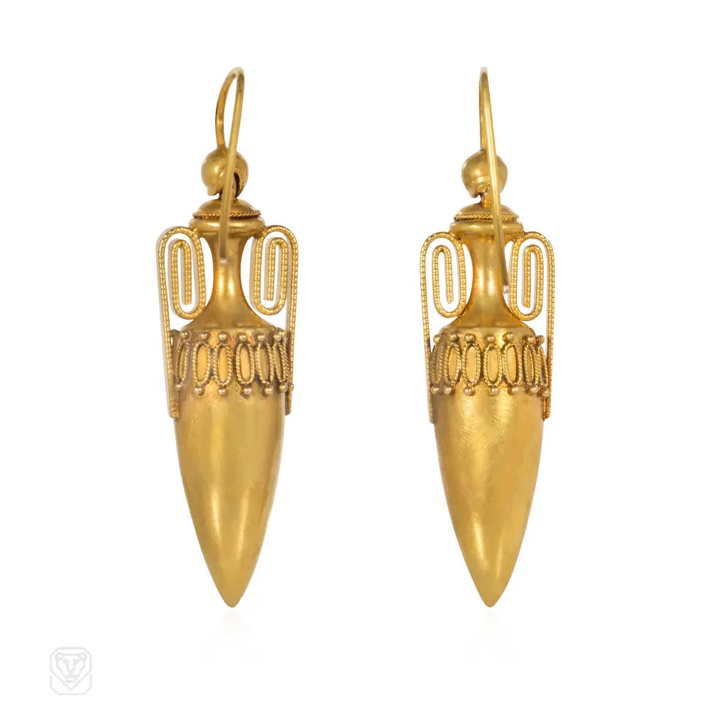 A pair of Victorian earrings in the form of amphorae with scrolled open work handles, in 15k.