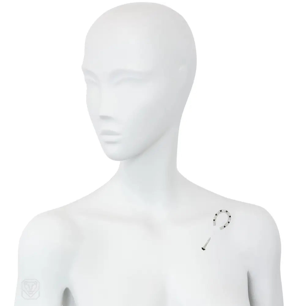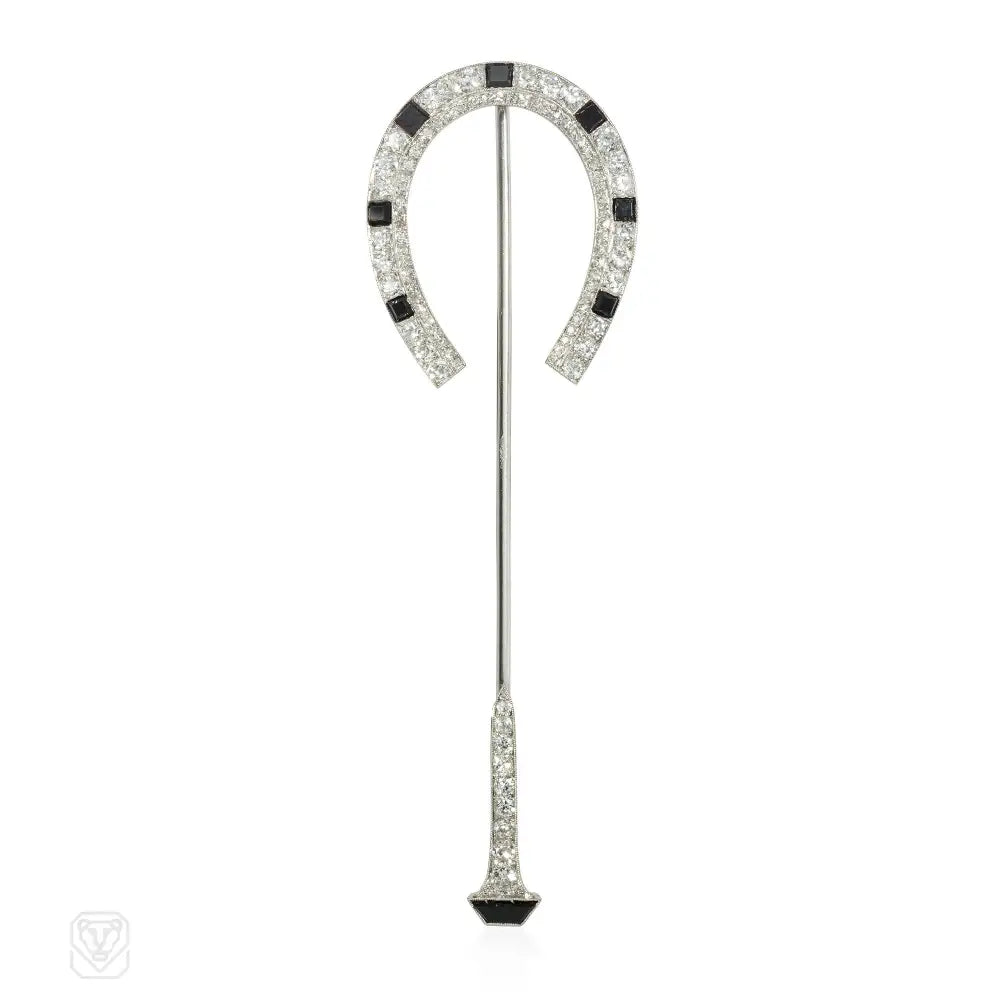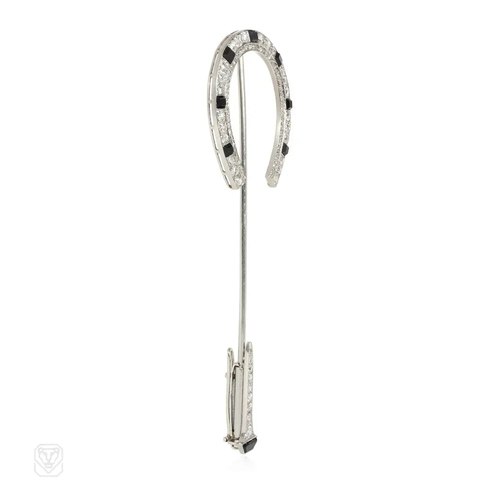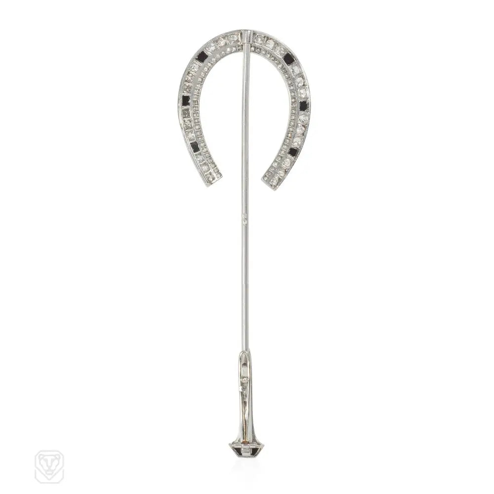 An Art Deco diamond and onyx equestrian jabot brooch comprised of a diamond and onyx horseshoe, terminating in a diamond and onyx hobnail, in platinum. Atw diamonds 1.25 cts. French import.