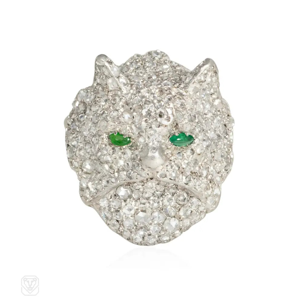 An Art Deco diamond brooch in the form of a cat with emerald eyes, in platinum.