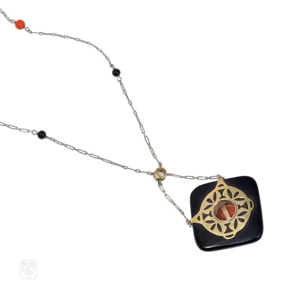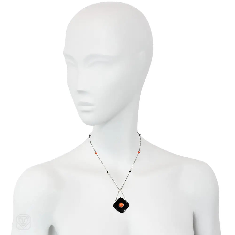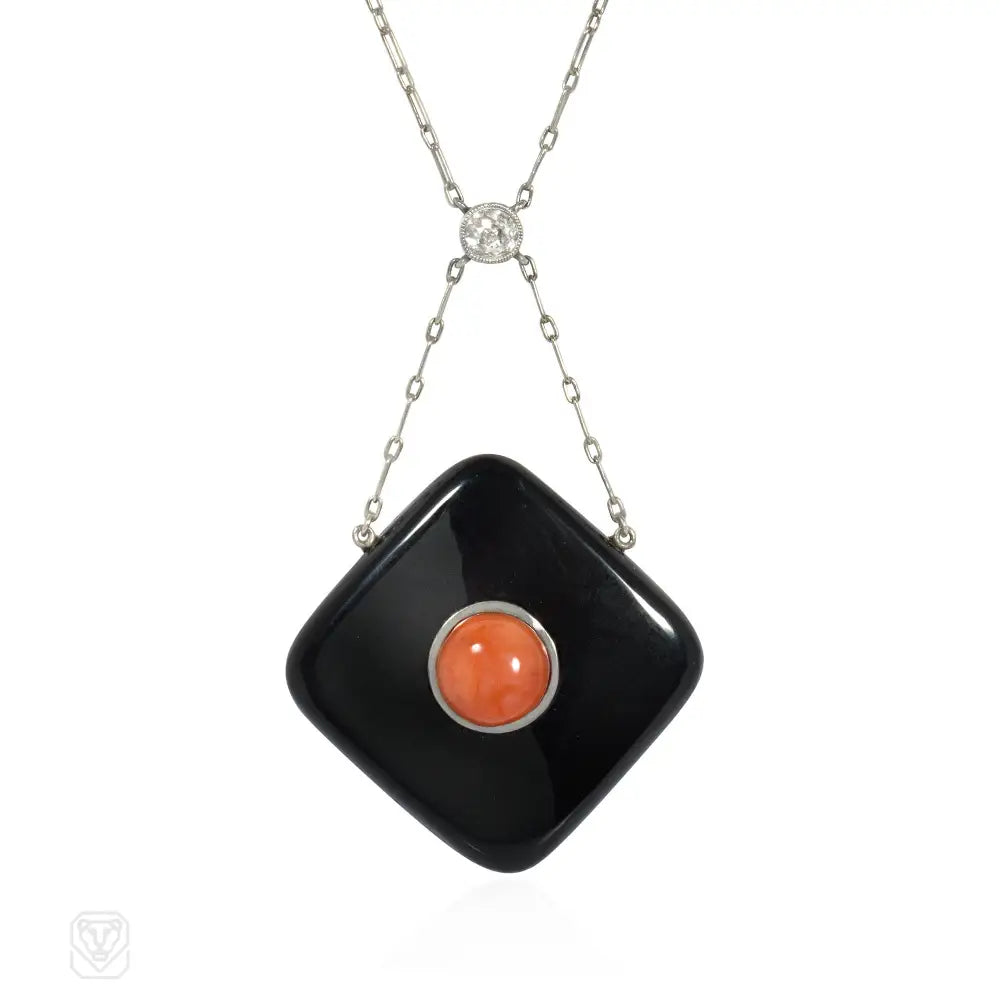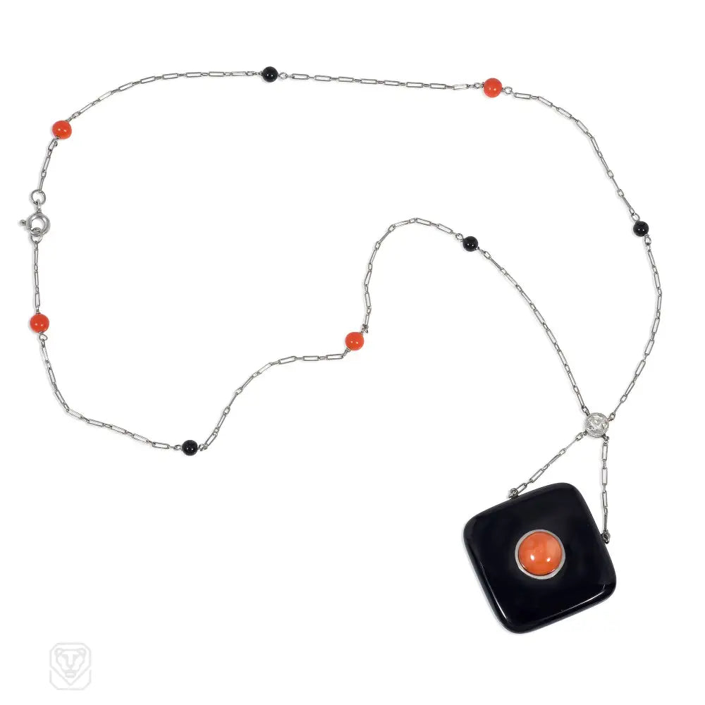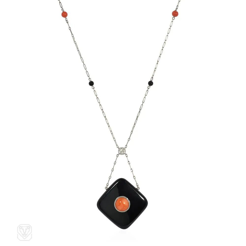 An Art Deco coral, onyx, diamond, and platinum necklace, comprised of an onyx lozenge centered by a collet-set coral cabochon, suspended by a platinum chain from a collet-set diamond with a millegrain border, the chain further embellished with coral and onyx beads, in platinum and 18k gold. Atw diamond 0.21 ct.