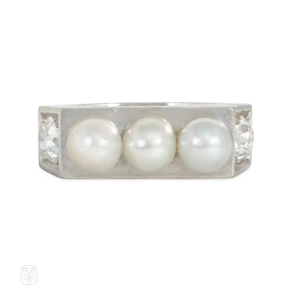 An Art Deco pearl and diamond ring of geometric design, centered by three natural pearls, and with canted shoulders featuring in-set diamonds, in platinum. France. Atw diamonds 1.00 ct.