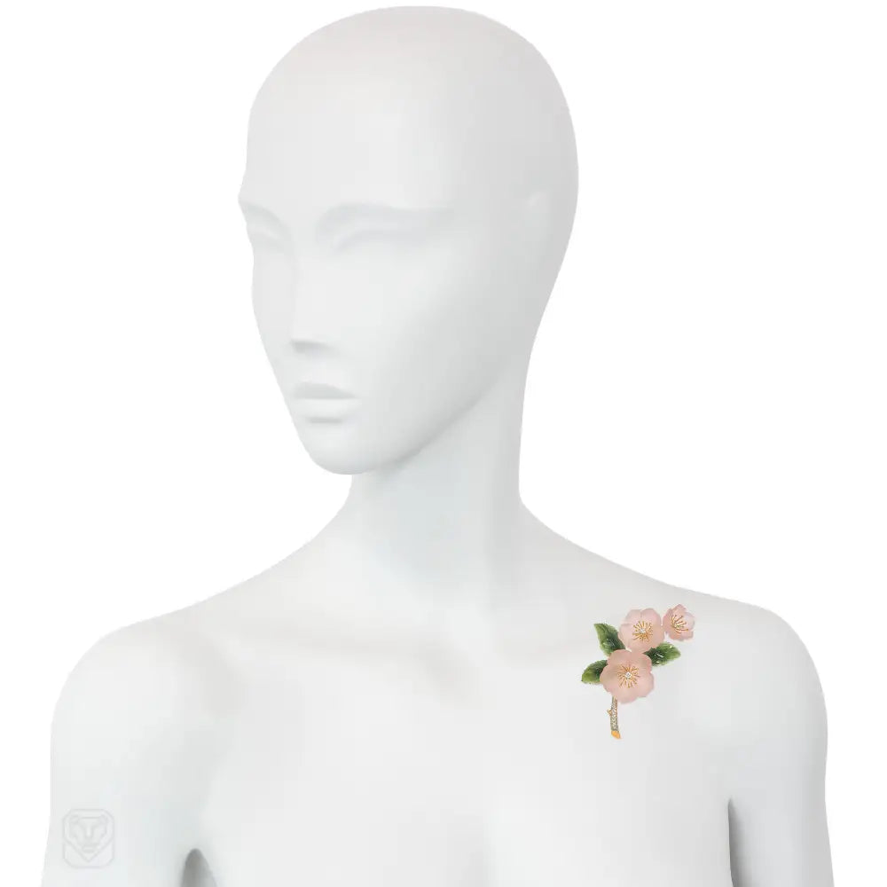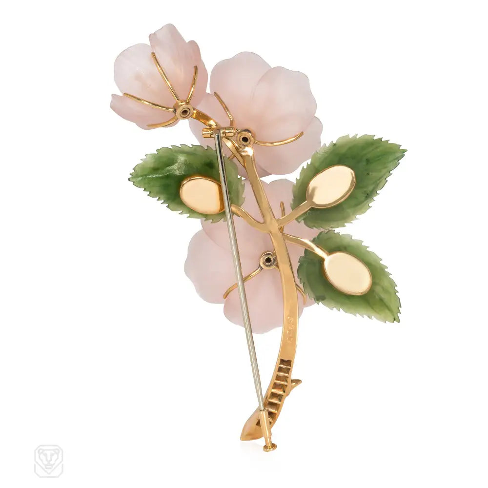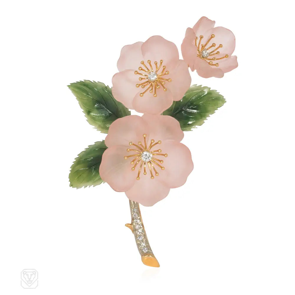 An Art Deco cherry blossom corsage brooch comprised of carved rose quartz flowers with nephrite leaves and gold and diamond embellishment, in 18k gold. A.E. Köchert, Vienna, Austro-Hungary. French import marks. Atw diamonds .50 ct.
