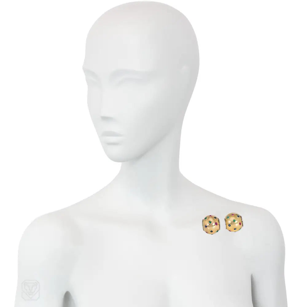 A pair of Art Moderne gold "Tonneau" clip brooches of bombé, barrel-shaped design set with rubies, sapphires, and emeralds, in sterling silver and 18k. Suzanne Belperron, France. Accompanied by a certificate of authenticity by Olivier Baroin. Maker's poinçon for Grœné et Darde