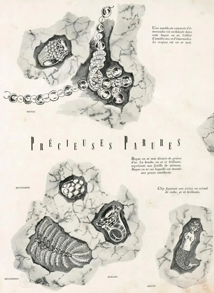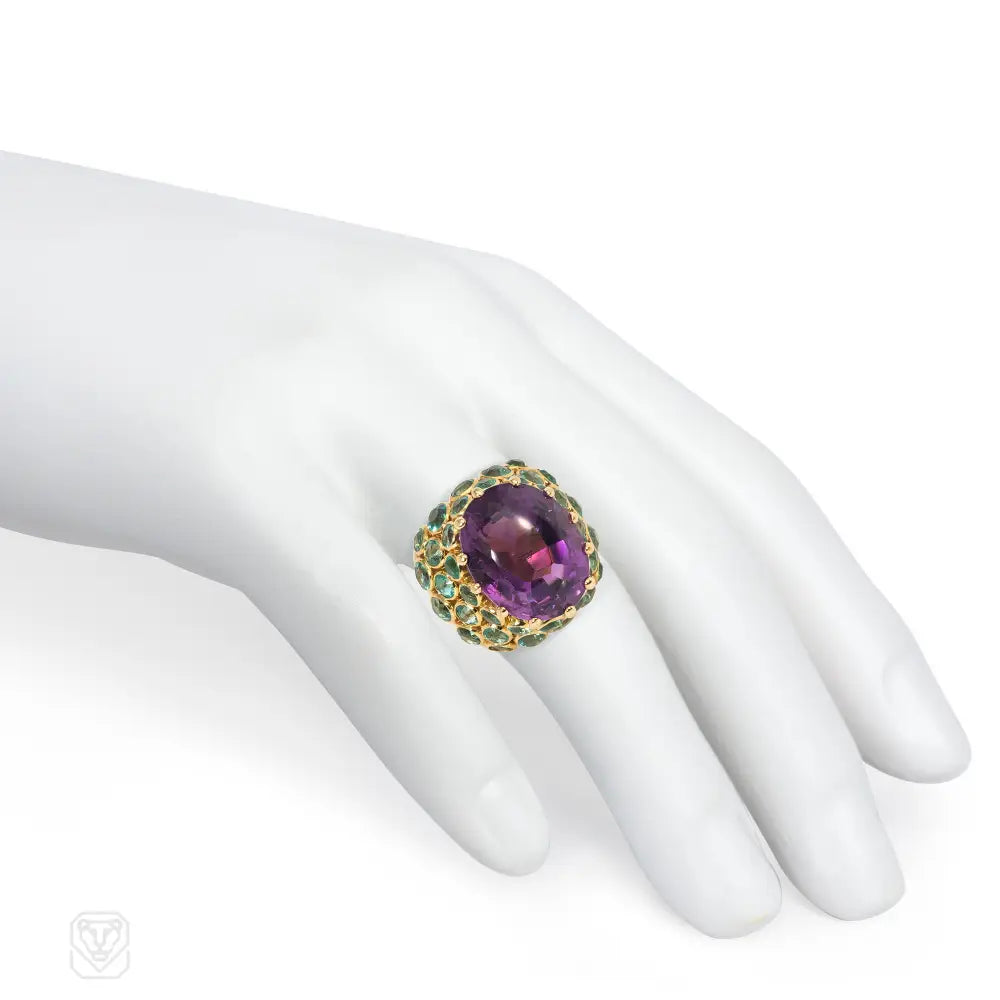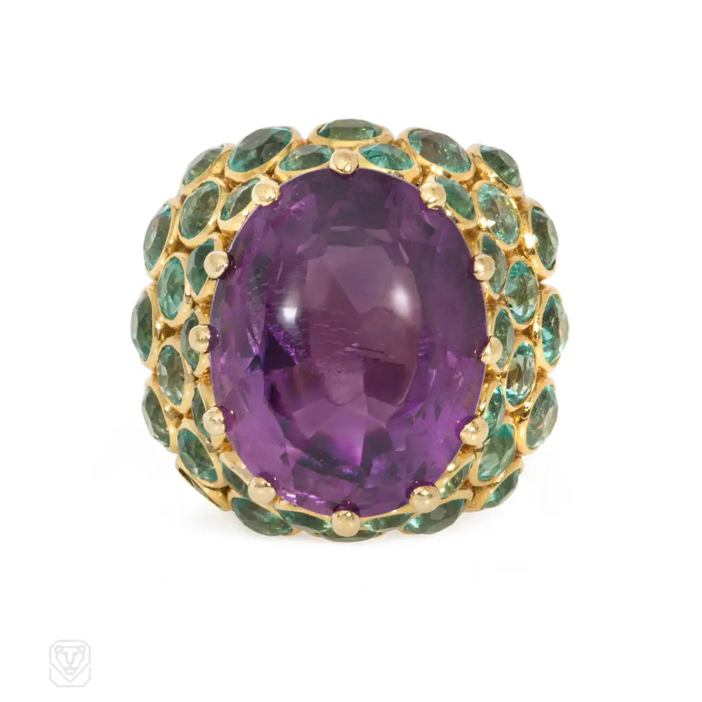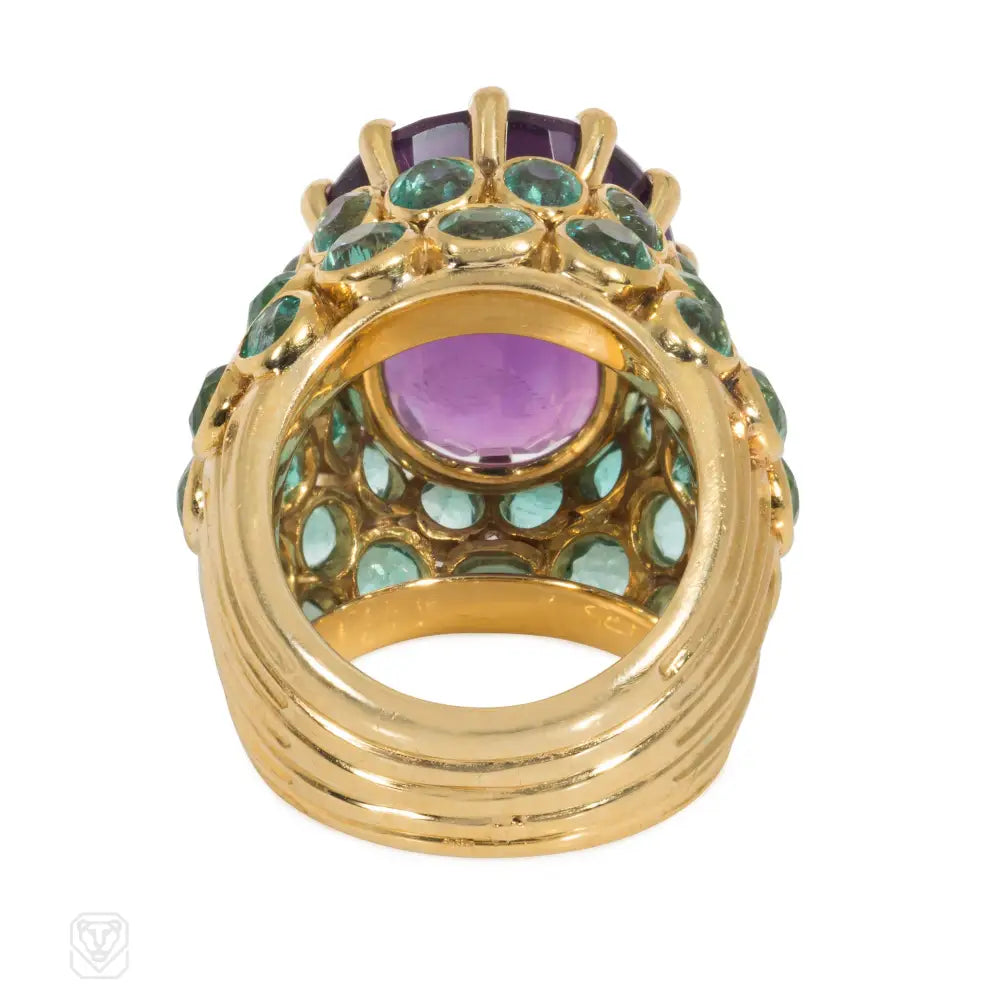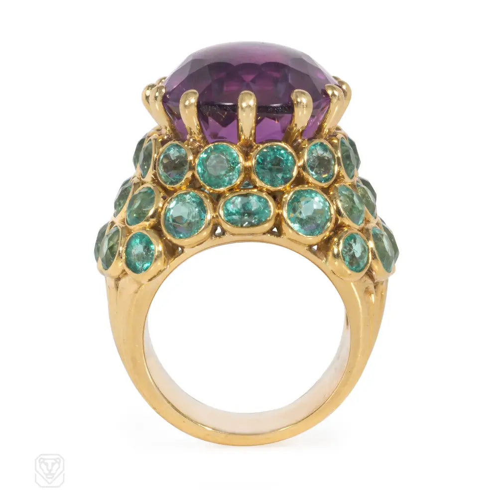An important Retro gold ring comprised of a central buff-top amethyst surrounded by three rows of collet-set emeralds, in 18k. Rene Boivin, France. Designed by Juliette Moutard, cert #202310EA.