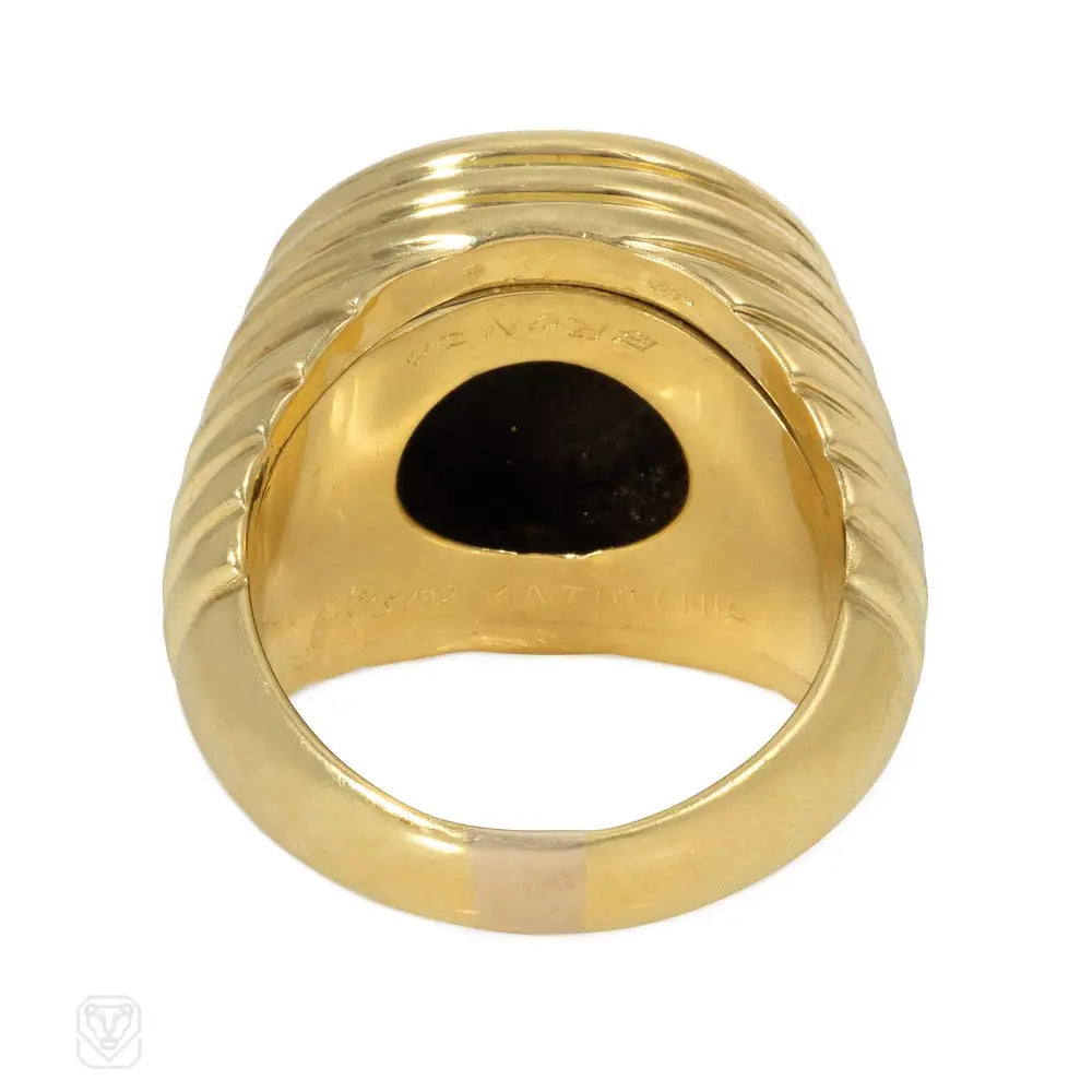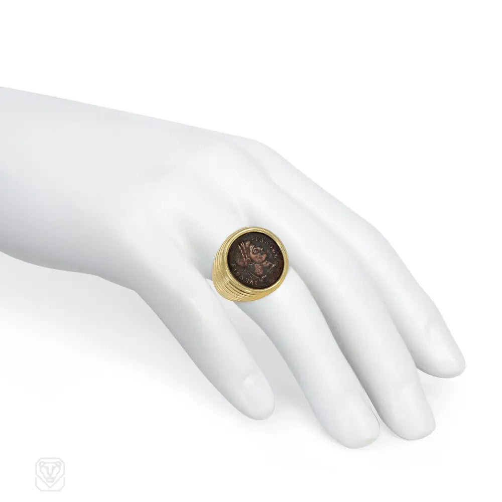 A ribbed gold and bronze coin "Monete" ring inset with a Crispo Antiochia coin, in 18k. Bulgari, Italy.