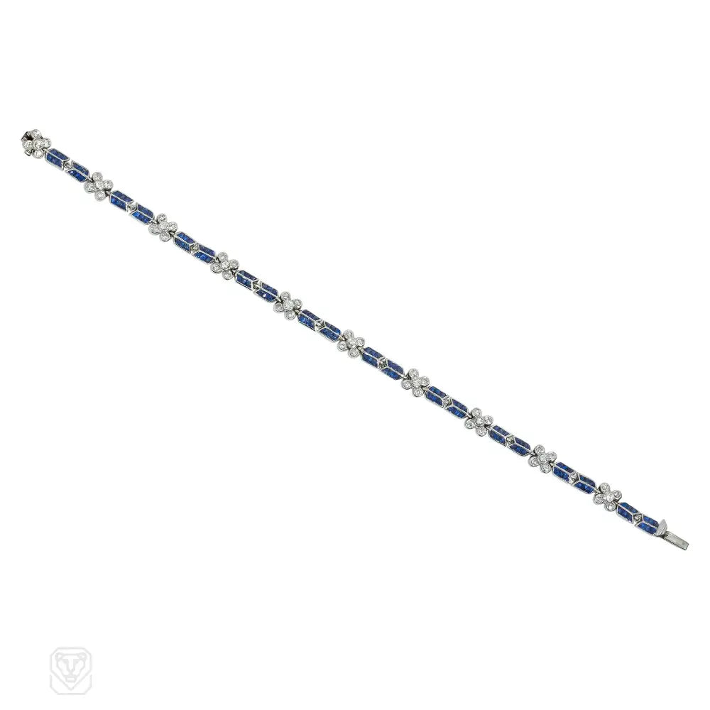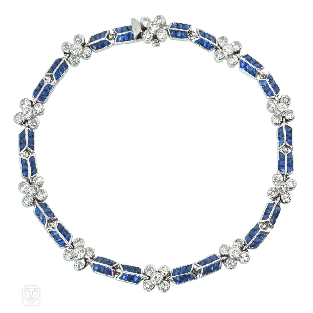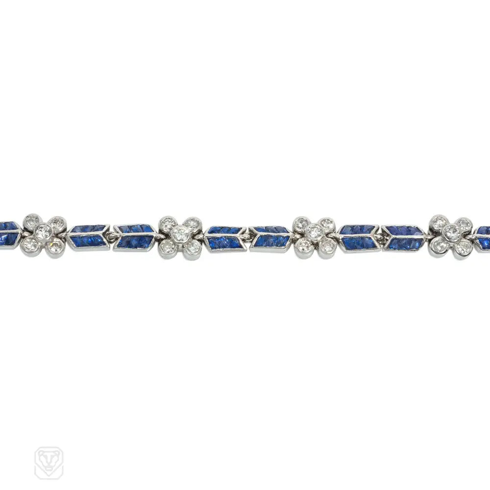 A bracelet comprised of calibré sapphire bar spacers with diamond florettes, in platinum. Atw diamonds 1.20 cts.