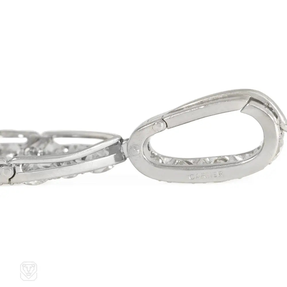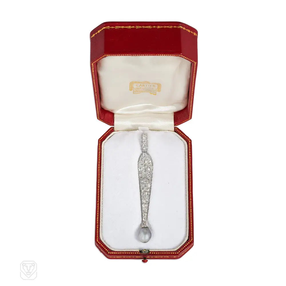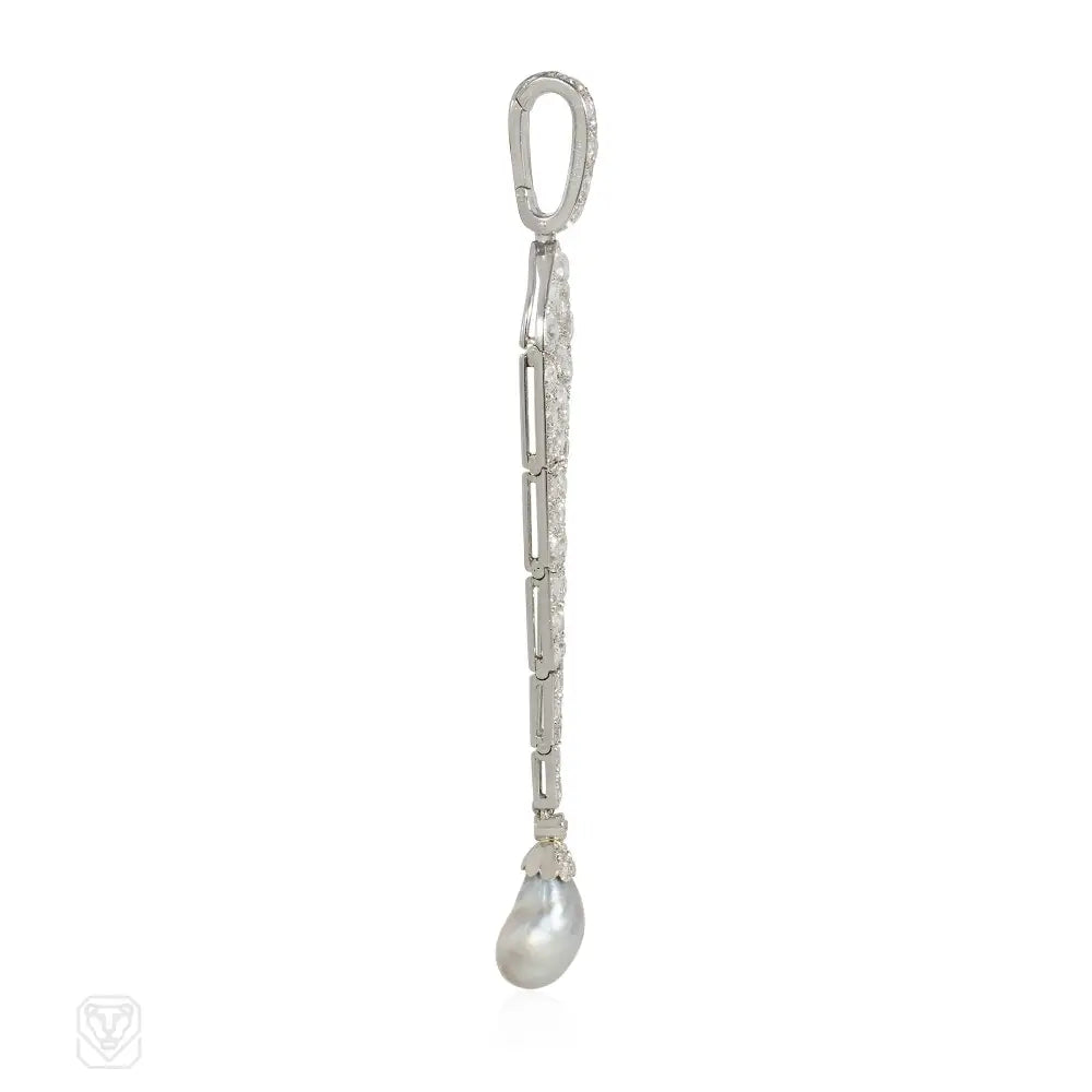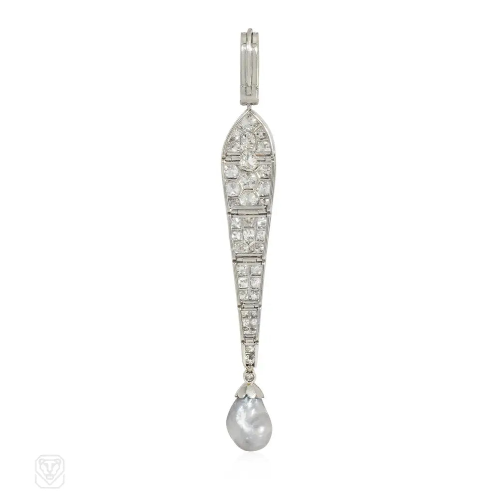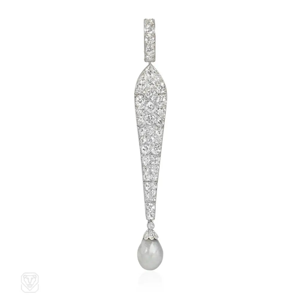An Art Deco pavé diamond pendant of tapering kite-shaped design terminating in a natural grey pearl, in platinum. Cartier, France. #01. Atw diamonds 2.50 cts. (Chain sold separately.)