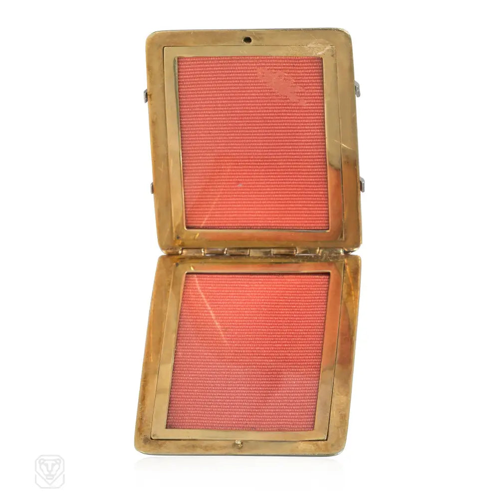 An Art Deco enamel and diamond locket opening vertically to reveal two picture compartments; the front of the locket centered by a segment of marbled green enamel set within platinum and diamond swagged and bow-tied borders, giving way to black enamel segments; the verso similarly arranged, but with simple platinum borders; in 18k and platinum.