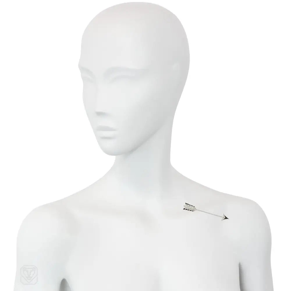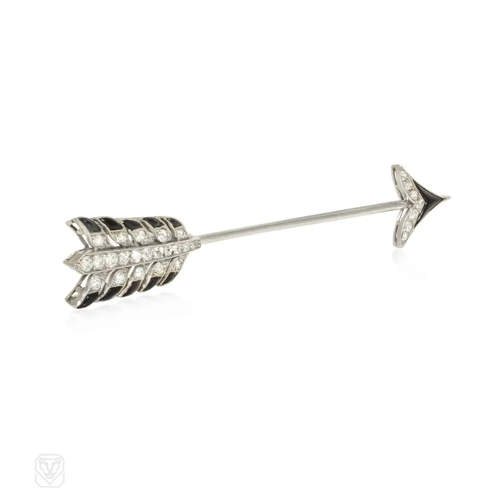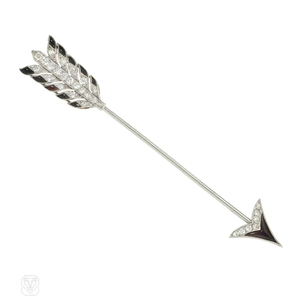 An Art Deco diamond and onyx jabot brooch designed as a cupid's arrow, in platinum. Atw diamonds .50 ct. France